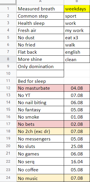 Здесь дофаминовый детокс, вылезаторство и вниманиеблядство Список слева(выше) древний как гавно мамонта. никогда не выполнял его целиком. Интересно выполнить назло детерменизму (не единственный мотиватор), стать стоиком и приводить себя в пример слабым б