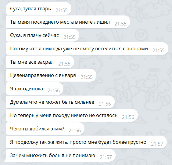 Честно говоря, очень тяжело формулировать мысли. Голова ватная. В конце прошлого месяца бросил пить таблетки и стал ежедневно пить, из-за этого появились проблемы со сном, сознание всегда притупленное. Мысли о роскомнадзоре не дают мне покоя, но зато придают чувство свободы. Я напоминаю себе, что я ничем не скован, я вправе идти на самые отчаянные поступки. У меня долгов на полмиллиона, но это не страшно, я до осени их закрою. Единственная причина, по которой я не совершил роскомнадзор - мне доставляет удовольствие писать музыку. Я не знаю нотную грамоту, пишу интуитивно. По правде говоря, я всегда недоволен результатом, и из-за неудовлетворенности я еще более эмоционально неустойчив, но все же верю, что ежедневными усилиями добьюсь результата. Эта ничем не подкрепленная вера - все, что у меня есть. Главная и единственная цель сейчас - научиться писать хоть сколько-то коммерчески успешную музыку, зарабатывать хотя бы на аренду жилья. Пока буду учиться писать биты. Нужно относиться к музыке как к ремеслу и настойчиво, день за днем создавать новый материал. В начале осени я в любом случае увольняюсь. С текущей жизнью покончено. Не важно, чего я раньше хотел и к чему стремился - ничего из этого не вышло, пора это признать. Как и где я буду жить после увольнения - неизвестно, это не имеет значения. Главное, что здесь и сейчас я отсрочил роскомнадзор, нашел для себя интерес продолжить существование.
