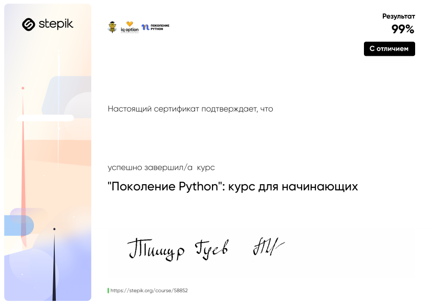 зокончил курс по питон для начинающих дали такой диплом. скачаю пдф и прикриплю к резюме. еще читал книгу но забросил из за того что мало времени. пока низнаю ни чего нимогу сказать об этом надо смотреть дальше...