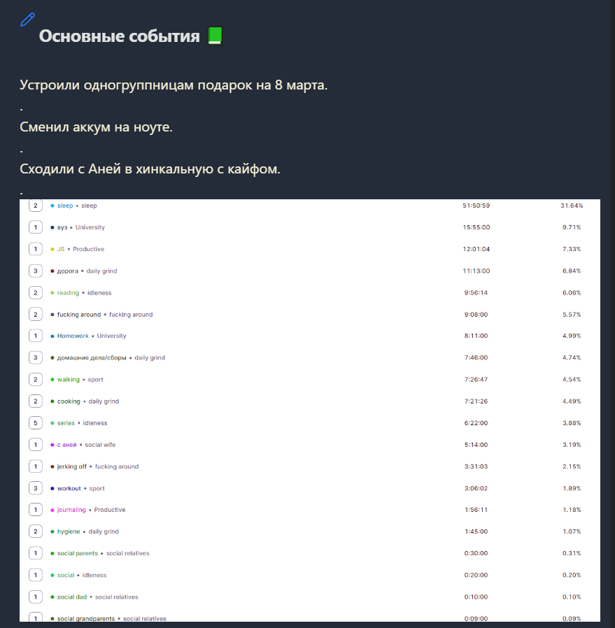 Это мерзкий дневник, и вроде бы решать такие дела надо по любви и тд, но в силу заеба, думаю, что таки надо подойти к этому делу с ведением статистики и аналитики.