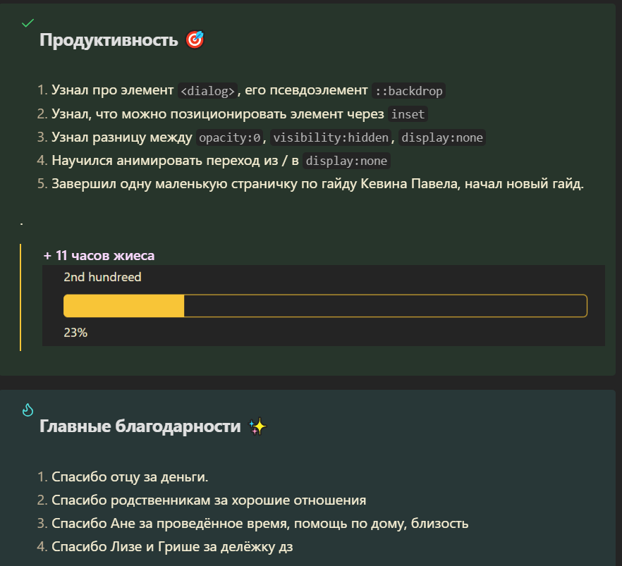 >>730815 (OP) День подходит к концу, а это значит что пора вспомнить все мои победы, все мои замечательно-очаровательные моменты из жизни - взять и выписать всё это в отдельную папку.