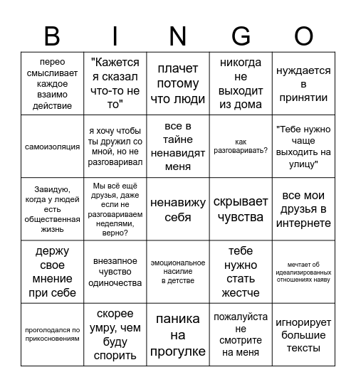 Кто я сегодня? ТРЕВОЖНИК/ПСИХACТЕНИК/ИЗБЕГАТОР. Основа — слабая малоподвижная нервная система, и прочая хуйня. Ого! Заполнил бинго. С сегодняшнего дня я оффициально социофоб.