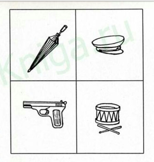 По картинкам: 1) Зонт. Остальные 3 предмета (фуражка, пистолет, барабан) ассоциируются с армией.
