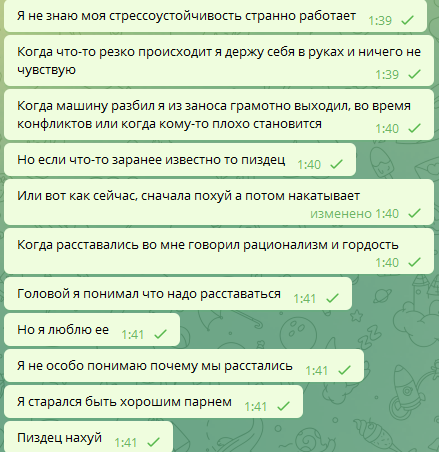 Расстались. Во время диалога на удивление был спокоен, потом даже шутил и всякое такое. Поебались на прощание. Мне кажется тянка расстроилась из-за моей похуистичной реакции. Но сейчас накатило, впервые наверное лет за 10 разревелся. Поэтому и пишу.