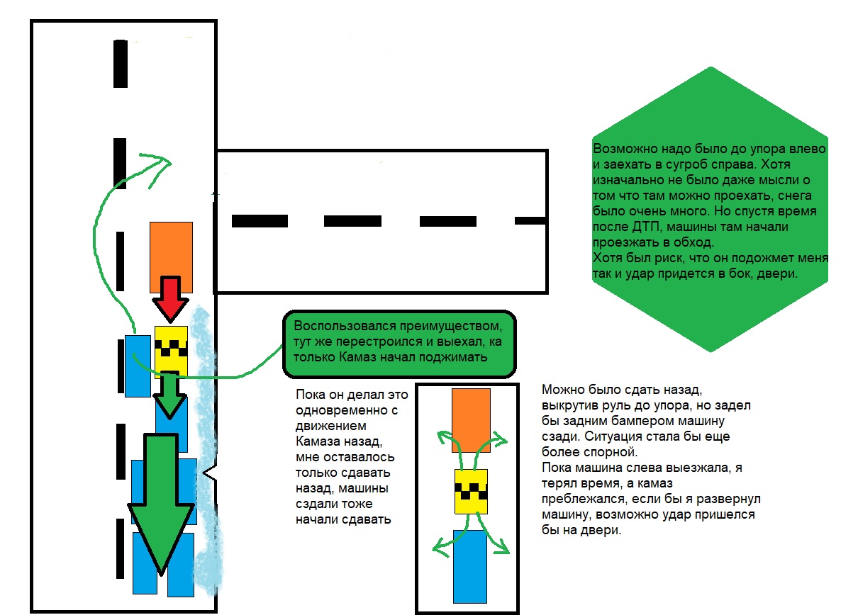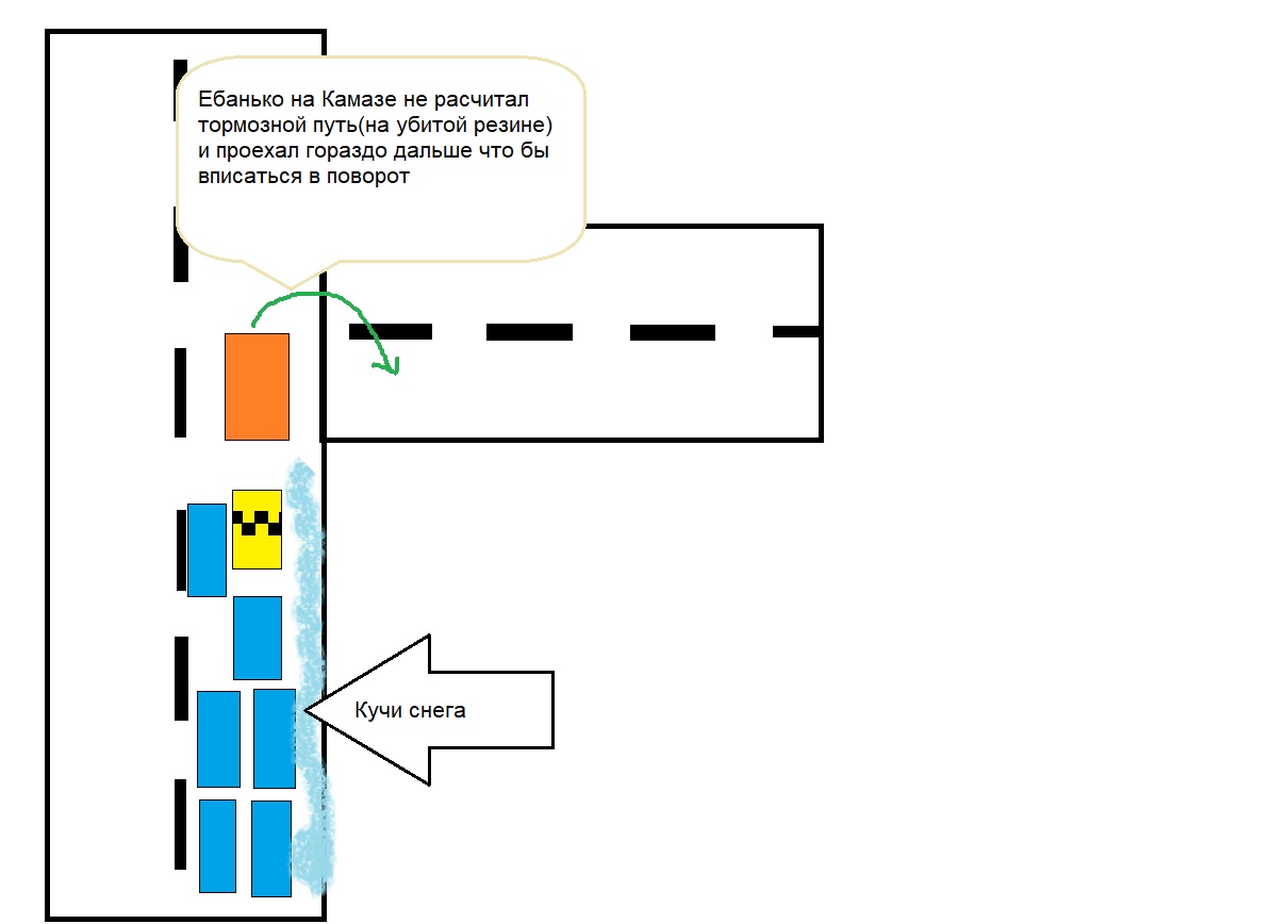 Это сука что-то с чем-то. Короче подкинули мне заказ, оч выгодный межгород, причем заранее, так что я нашел на обратную дорогу пассажиров через блаблакар. Еду в жуткую метель, ну и похуй, аккуратно, туда доехал ОК. Забрал двух клиентов, 3 отменил бронь, чему я был только рад, так как его оставлять было в неудобном месте. Но в приложухе стояла свободная бронь и тут навязался другой чел, звонит, "говорит Я РЯДОМ, РЯДОМ, ЩА 3 МИНУТЫ". Сомневался, брать его или нет, но взял, он же рядом, уже тут, че кидать его? И поехал обратно с грузом на душе. Ну да ладно, высадил его по пути, заправился, почти доехали, начался разговор с пассажирами, мол плохая погода, ужас какой, а мы мол так хорошо доехали. Я тогда про себя подумал, еще не доехали, хотя осталось совсем чуть чуть. Пророческие мысли. И вот он момент, смотрите пикчи. Хуесос не рассчитал способность торможения своего Камаза на убитой резине и почти проехал поворот, он уже ни как не вписался бы туда. И он сука начинает сдавать назад, пассажиры охают. Он остановился, потом еще раз назад, тут уже я назад, чел слева от меня тоже едет назад, а потом выруливает на встречку и уезжает, камаз приближается, я сигналю, дебилы сзади даже не двигаются, только спустя драгоценные секунды. Вот вот задену бампер машины сзади, они уже никуда не едут. Что делать? Таранить машину сзади? Выкрутить руль и попробовать выехать коцанув тачку сзади? Можно было встрять боком и удар пришелся бы в боковые двери. Справа намело сугробов, даже мыслей не было там ехать, да и опять же, все произошло пзидец как быстро. И вот он удар, скрип метала, я тогда четко понял, вот это момент, когда сон становится явью. Это не изменить, это уже факт, событие. Передо мной зад фуры на моем капоте, кто-то сзади кричит, кто-то сигналит. Это не сон. ЭТО БЛЯТЬ НЕ СОН!