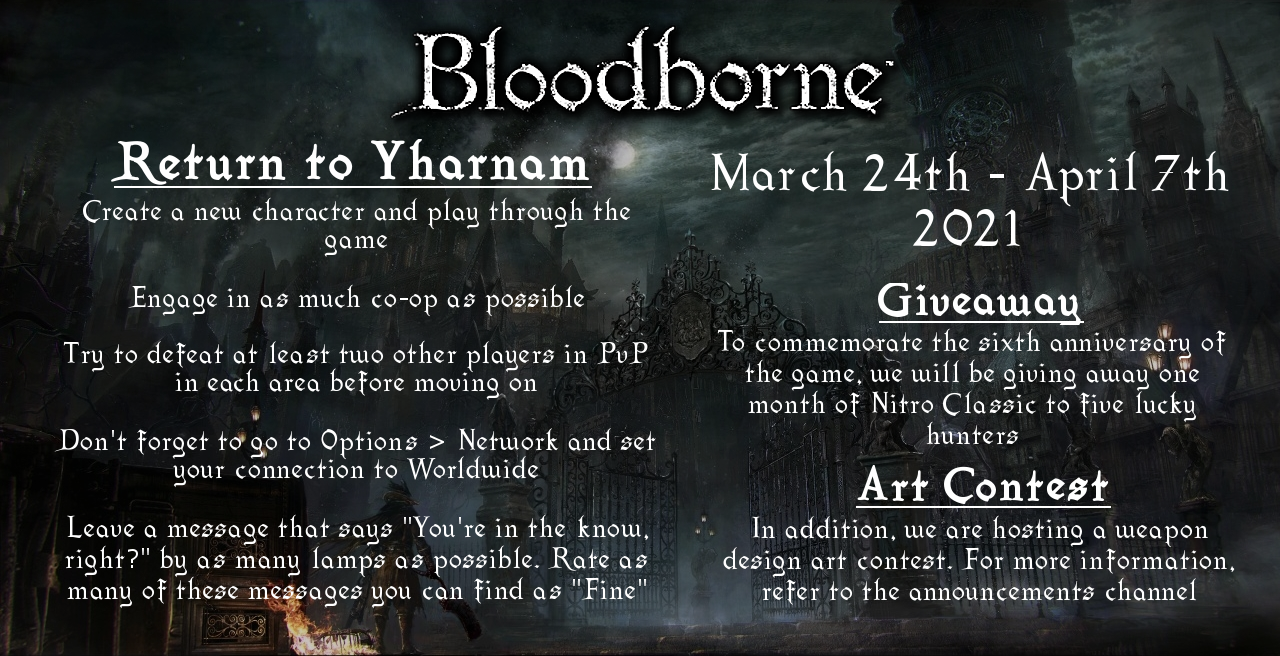 24 марта стартует RETURN TO YHARHAM в Bloodborne, игра ради которой я купил пс4, ни разу не пожалел. Фишка эвента в том, что будет играть очень много людей, будет онлайн хороший, взаимодействие, а я ни разу не играл в онлайн. Куплю подписку пс+ и буду играть.