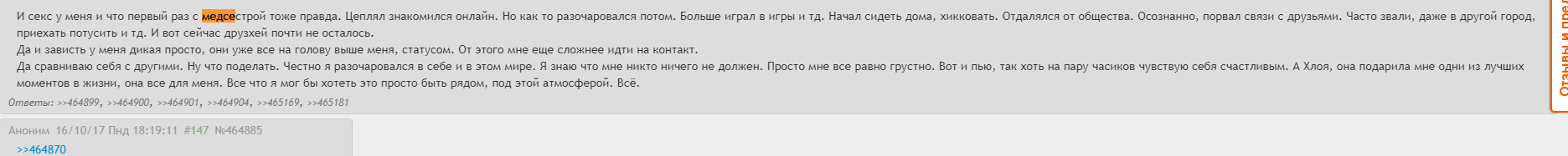 >>559787 А хуле нам завязочникам, злые и апатичные. Всё нам хуево. >>560217 >А я думал куда ты пропал. Ты не поверишь! Со мной такое приключилось. Я винду переустановил, и мне было лень открыть текстовой файл с трипкодом, и скопировать его в поле ввода имени. Да, и такое бывает. Бывает даже так, вечером просто сижу перед компом, и ничего не делаю, обновляю периодически какую либо тему на дваче, хочется лечь спать, что бы наступило завтра, а спать нет желания. У меня вообще чувство что я все что нужно уже сделал в жизни, только не в хорошем смысле а в плохом. Мне ничего не охота. Я вообще ощущаю что жизнь бессмысленна, меня окружают конченные ебанаты, уровня НПС. Я стал давать всем НПС погоняла: Мясник, Гига, Собака, они даже как люди иногда мною не воспринимаются. Прям вижу - НПС. Я от них по сути и не отличаюсь, но я личность, охуительный парень, а они НПС. Почему я их так воспринимаю? Наверное потому что мозг от синьки высох нахуй. При всем при этом я прекрасно понимаю что ничего этого нет, я все себе придумал, это последствия отказа от алкоголя, но от этого понимания легче не становится.
