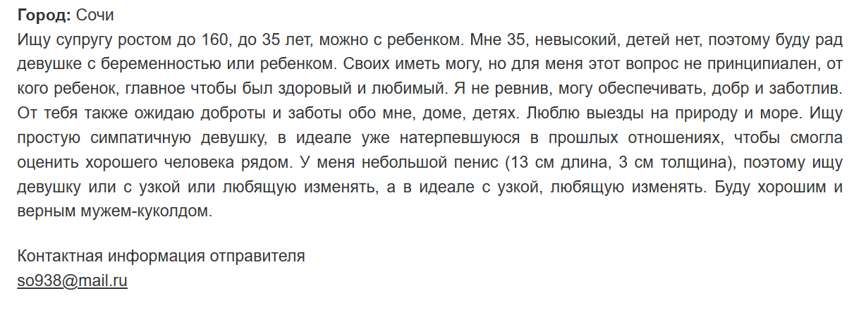 Состою уже 2 года в серьёзных отношениях с девушкой. Живём душа в душу! Скоро свадьбу будем играть. У неё двое детей от прошлого неудачного брака. Разве жизнь на этом заканчивается?! Вы, двачеры, просто жизни реальной не знаете. Молодая была, опыта не было, не разобралась что к чему. Козёл её бывший негодяй пил, гулял, бил её несчастную! Она не всё успевает по дому. Я помогаю стирать, убираю квартиру, готовлю, в садик отвожу детишек. И конечно не смогла карьеру построить. Дети это вам не шутка! Воспитание и уход поглощают всё время. Поэтому работаю я один. 250 т.р. в месяц на семью хватает вполне. Даже удаётся скопить на путешествия и дорогие подарки. Любимая с подружками помешаны на истории Турции и Египта, обожают ездить туда смотреть развалины всякие. Мне это не интересно совсем. На права отправил учиться, хочу ей машину подарить. Ипотеку вот взяли. Нужно расширять жизненное пространство!