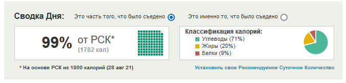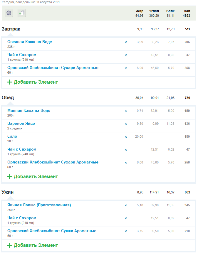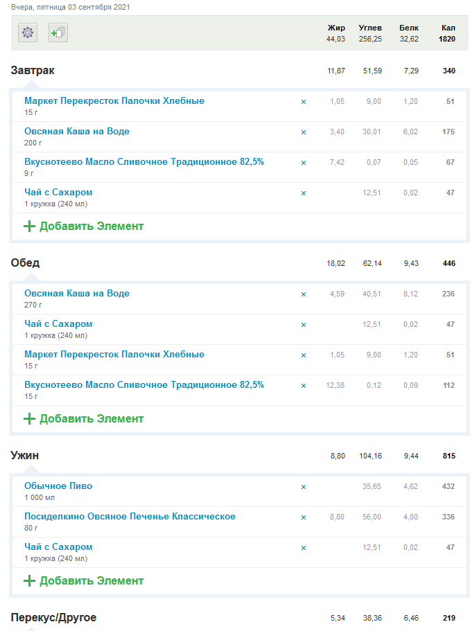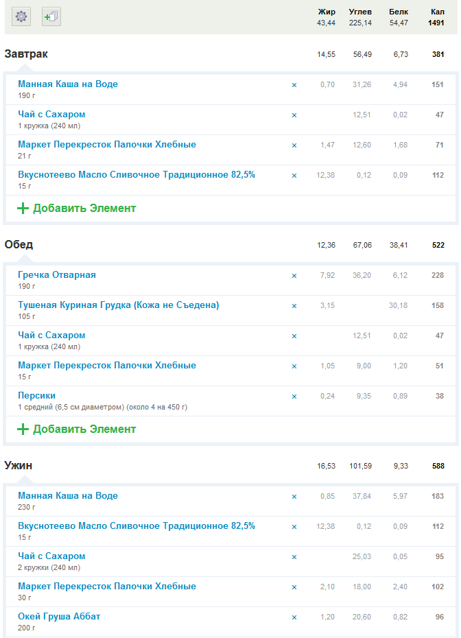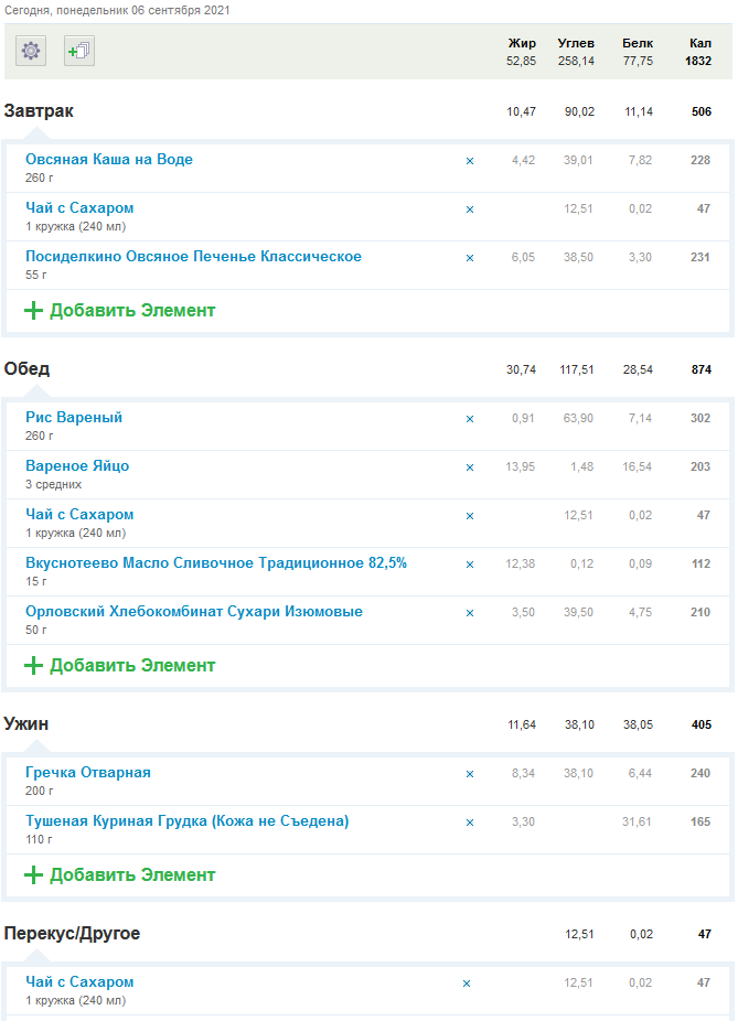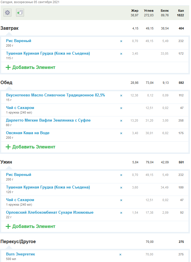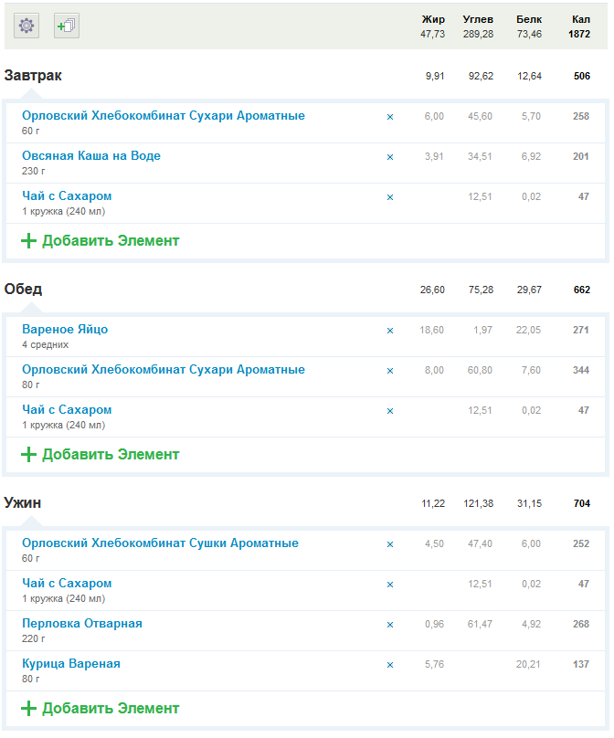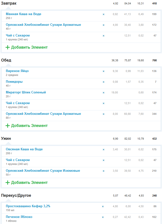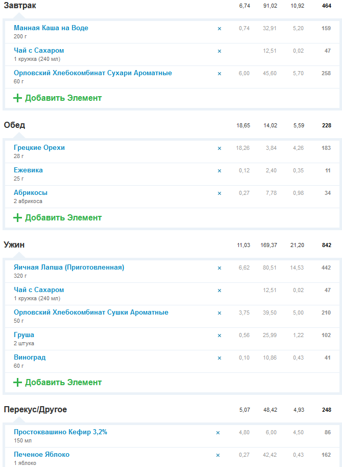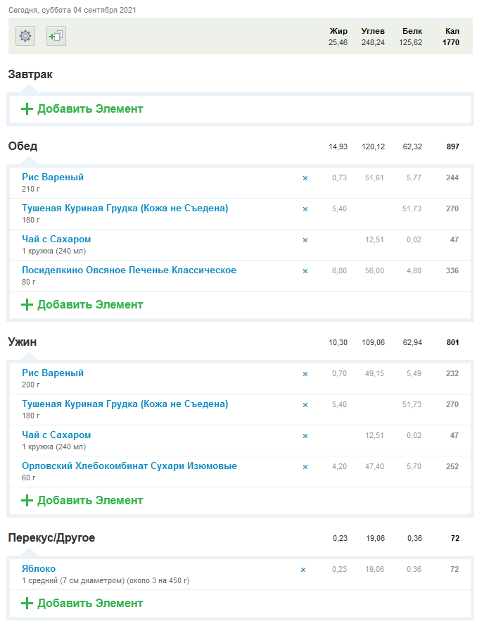 Чуть не забыл. Подставил читателей своего интересного бложика. Это то, что вчера сожрал. Плюс вечером примерно 150 грамм гречки с курицей, чтобы добить до 1800. Но вносить не стал.