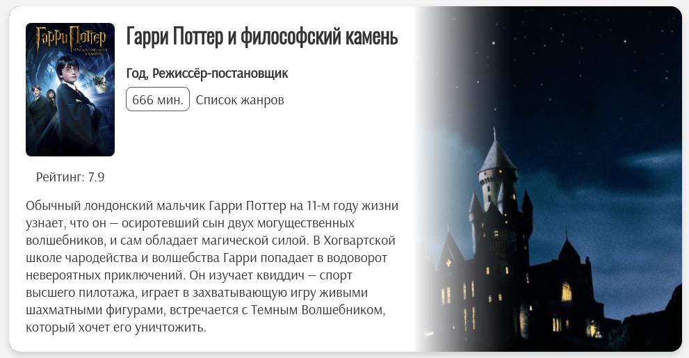 Фильмы вроде ищутся, но ещё надо будет разобраться, как доставать дополнительную информацию о них (режиссёра-постановщика, длительность, постеры в разрешении побольше). Локализацию, тёмную тему, анимации ещё, наверное, надо сделать. Но я пока что со стилями туплю очень сильно.