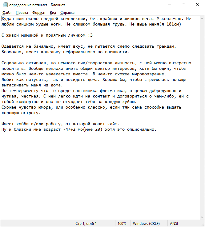 Для меня лично Марин на долгое время будет в топ тире, потому что она крайне метко попала в мои представления об одной из вариаций идеальной тян. В том числе и одну из вариаций внешнего идеала, хоть и не полностью. Помню ещё очень давно написал себе пасту для очередного платиного треда "а какой должна быть твоя идеальная тян?", которую я сохранил в блокноте и годами вбрасывал в похожие треды рофла ради. И она совпадает практически по всем параметрам, что удивительно даже в плане личных качеств. Пожалуй приложу эту пасту к картинкам, а я её написал ещё наверное когда мне было лет 20 примерно, а по-сути ничего особо в предпочтениях не поменялось. И ведь рил, несколько неформальная тян с гик/виабу увлечениями, достаточно социально-активная, но и дома любит посидеть за теми же своими увлечениями, о которых она готова болтать без умолку, по темпераменту она скорее сангвиник, также она крайне чуткий и добродушный человек, который никогда не осудит тебя за твои взгляды/увлечения. Качества на самом деле невероятно ценные, особенно в мире где постоянно сталкиваешься с непониманием и осуждением. Остальное даже перечислять не буду, параллели и так легко можно провести. Поэтому да, Марин Китагава топ1 вайфу