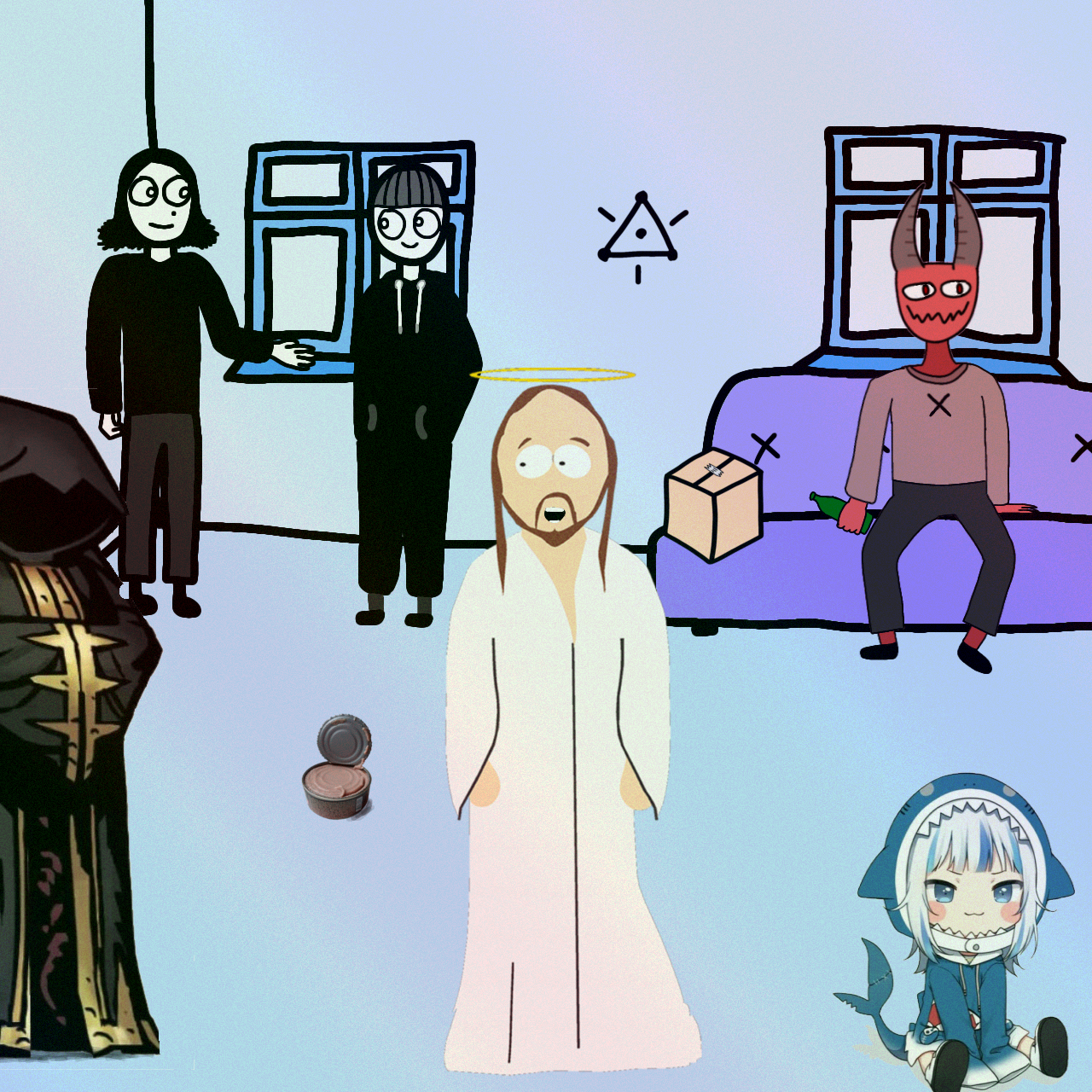 А сегодня я расскажу вам о очень интересном мероприятия, которое длилось примерно 6 часов почти беспрерывного мысленного потока - Божественная вечеринка. Место действия: рай, небеса. Событие на котором было максимальное количество персонажей за всю историю моей больной башки. Иисус попросил меня помочь с созданием вечеринки, пока его отец (Бог) ушёл по делам. Мы с Владом украшали помещение, готовили еду, звали гостей и тому подобное. На ней были: Влад, Крестик, шестой (плохой голос который меня всё время пытался выбисить, но после того как я кое-что ему сделал он перестал меня донимать), я, Иисус (который имеет рисовку Саус парка), культ жемчужины (о котором я когда-нибудь ещё напишу), иноплонетяни, док, Гавр Гура и многие, многие другие. Мы танцевали, пели песни и просто общались, Так же когда я включал какую нибудь песню, то появлялся артист который её пел и исполнял как бы "в живую". Проходила вечеринка примерно с ночь 13 по утро 14 июля, 2021. Все персонажи которые присутствовали на этом мероприятии были либо богоподобны либо в хороших отношениях с богом и его сыном, что в свою очередь почти не противоречит его "заповеди" - (смертным на небо нельзя), других заповедей у бога в моей голове нет. Чтобы Влад смог попасть на это мероприятие, я сделал его полубогом (просто дал ему это звание, без каких либо способностей). После этой великолепной вечеринки, Я сделал то что не стоило делать и тем самым создал Иня после чего у меня случился самый сильный психоз и меня увезли в психушку, это был первый раз.