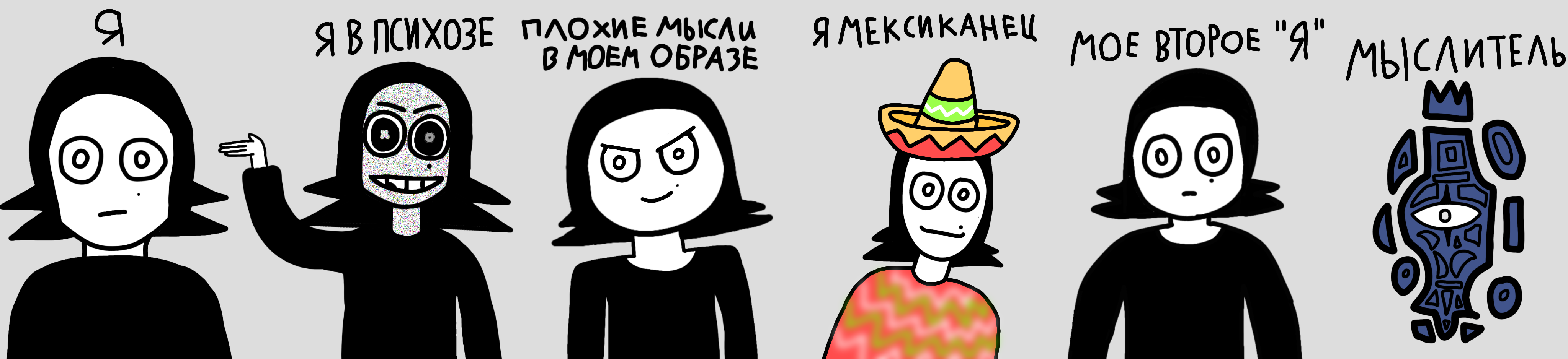 Мыслитель. Конечно, с моим ликом он нечего общего не имеет, но он как бы часть меня хотя по сути все голоса часть меня, но он больше!, незнаю как объяснить. Появился когда мы с Владом бухали, он говорил, мол, хуле вы тут саморазрушением занимайтесь?! По сути он прав, но я сказал ему о том какого я мнения об этом, о том что похуй как долго я проживу с таким диагнозом, о том что хочу получать удовольствие пока не сдохну.