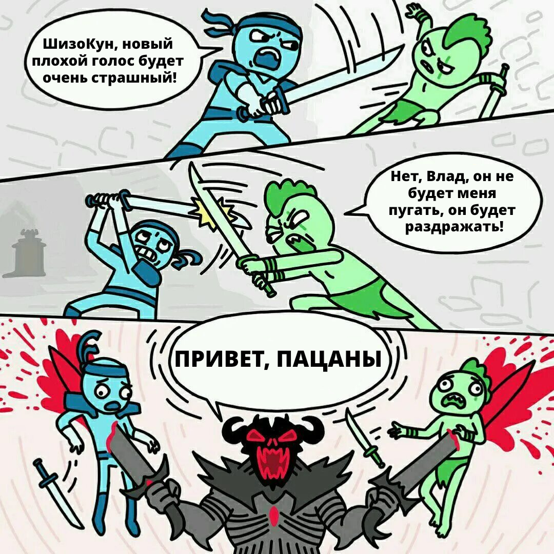 Так как сегодня нечего шизофреничного особо не происходило, и я был в основном нацелен на ЕОТ, расскажу вот про что: В последнее время когда у меня появляются плохие голоса, они имеют образ каких-то мемов, лол. Я уже говорил что был голос с образом искаженного мистера исключительного, теперь появился демон (или воин, хз кто это) из мема - второй пик. Незнаю, видимо я очень много мемов смотрю. Кстати последнии три плохих голоса, в основном, меньше чем через час становятся дефолтными, видимо у меня срабатывает защита. Я думаю о том что мне страшно, появляется ебака, я начинаю разговаривать с ней, она становится дефолтной. Почти всех ебак можно победить разговором.