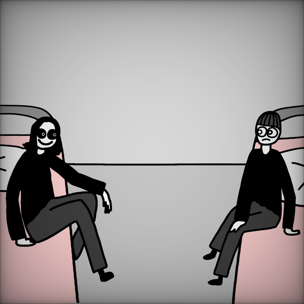 Серая комната - так называемая отправная точка, в основном мой "разум" находится в ней. Комната в моей голове в которой обычно сидит Влад и я. В этой комнате всегда есть "шкаф Саши" и окно, в ней могут появиться: кровать, стол с компьютером, лампочка, стол и стулья, телевизор и другой реквизит. В неё могут зайти любые голоса (а точнее их образы). Обычно, когда я рисую серую комнату, я так же рисую настенный календарь. Это связано с тем что я вёл свои собственные календари, где в меленькой клетке я рисовал то что мне больше всего запомнилось за день. Всего у меня 10 календарей, моя "неделя" длилась от 6 до 7 дней, а сам месяц от 36 дней до 49.