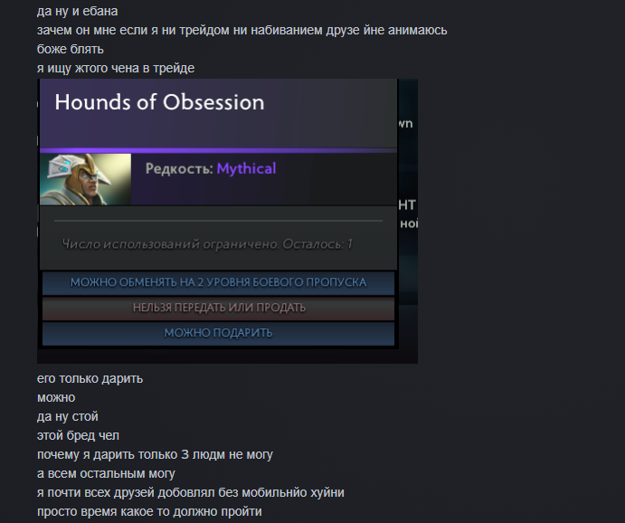 Кореш сказал что меня нет в списке тех, кому он может дарить шмотки. Вернее он и раньше это говорил, но я не верил. Выяснялось не может потому что не привязал стим к мобиле. Причем он в упор не хотел это делать, более того, говорит что в свое время отвязал, ибо это ебало мозг. В общем я его убедил и он с большим скрипом закинул мне чечена. Теперь придется долго наяривать против ботов и биндить кнопки отдельно на каждого лесного крипа