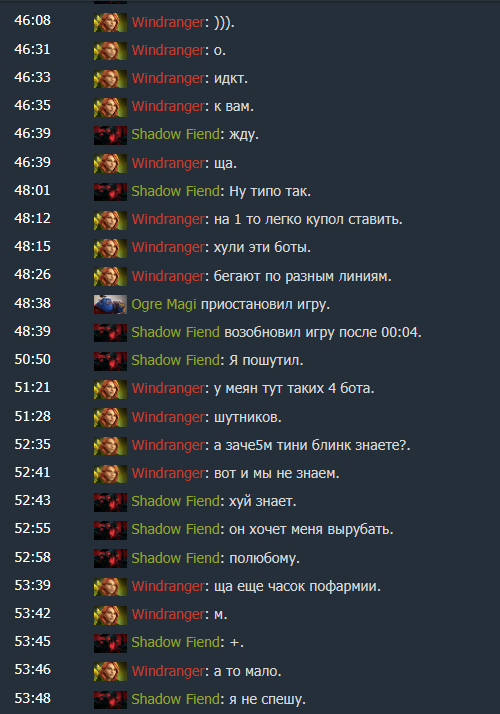 Сегдня катал. Я на вр, со мной на топе троль, на миде варден, внизу некр и веник. Против нас сало, сларк, пудж, пб и вилка. Из пика очевидно что после 30 минут шансы на победу у нас катострофически падают. Крч моя тима играла от дефа, фармила лес, тянула время. Первые 30 минут счёт был на равных. Дальше не трудно догадаться сларк начал ЕБАШИТЬ, у пуджа к концу игры 6к хп. Ну ещё гении максимум ставили желтые варды, а хули тратиться на синие то, а тем более на дасты. Короче на 50 какой то минуте нас вынесли всех и сразу в трон. ГГ Я кстати успел неплохо пропушить топ, но хули толку если эти дебилы вместо файтинга дрочили лес, а потом просто отсосали. Да и пушить мне особо не давали. Короче ебанная игра, я из-за дебилов в тиме просто всё настроение теряю. Хуй с ним с батл пасом, до следующего года.