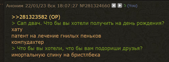 >>651923 > А ты в тиме катаешь? Пробовал, не вариант. Пикрилейтед. Причем были два челика с которыми мы выигрывали все игры, но им нужен был сапорт, а я не хотел сидеть на вторы ролях, поэтому наши пути разошлись. Потом я апнул легенду 5 на очень хуевом компе, то есть потенциально мог бы катать на властилине или выше. > Я то играю с рандом челиками Я пытался играть с друзьями, но они буквально ничем не отличаются от рандомных руинеров. Даже размутить не удосуживаются. > из-за такой хуйни и бросал дотку, Я бросал когда по 10 часов в сутки сидел в свинорезе и обсуждал что там у хохлов. Потом Габен раздал халяву и с тех пор к хохлосрачу не возвращался. > Иногда уже по пику ясно что мы ПРОЕБАЛИ Бывает уверен что луз даже ставку не делаю, а потом выигрываем говнопиком против оверпика. Просто все понимают что по одному нас разьебут и бегаем сугубу впятером с Котлом и минером.
