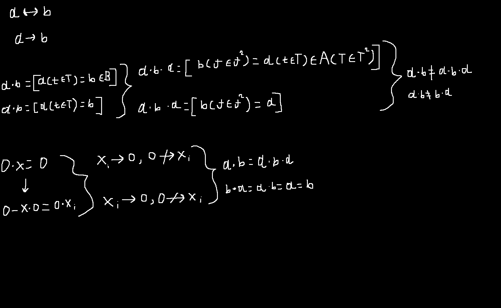 А так условия те это конечно гуд, но может же быть ещё что-то? Конечно же. aXbXc=aXc,bXc, при ентом какбы a,b не равны между собой, да. А вот уже ac и bc не знаю. Если c есть в А и в Б, тоооооооооо, ну тогда не равны? Пока что. Если же c что-то иное, к примеру ровно тоже самое что и aXb, то получаеца, что ac=a, abc=a, значит ac=abc? Конечно же нет, ac=/=abc, хотя ac=a. А, ну да, логично же, что ac=/=ab из-за того, что енто разные сущности хотя-бы, точно. Но они могут быть изоморфны, да.