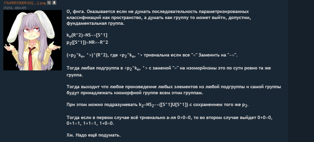 >>832153 >>832155 А, так вот я тогда начал заниматься метафизикой чтобы я смог из реальности уйти в другую реальность которая была бы похожа на тот мой период, но может с дополнениями по типо умения летать. Там понадобилась математика. Ну вот я и понял, что я по сути могу и так и сяк этим заниматься, в игры играть и на дваче сидеть - но просто всё настроение рушится от противоречивости.