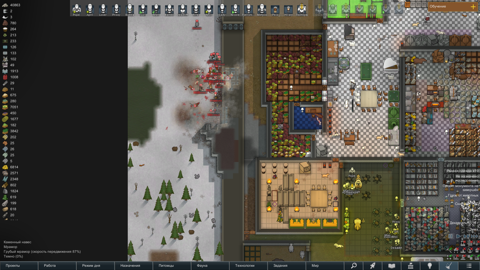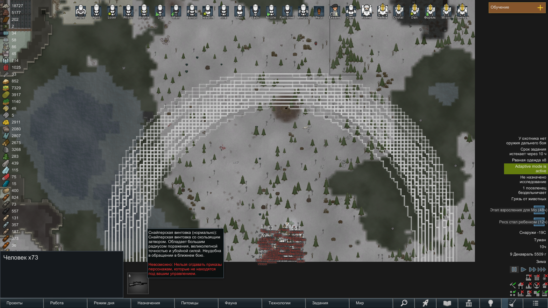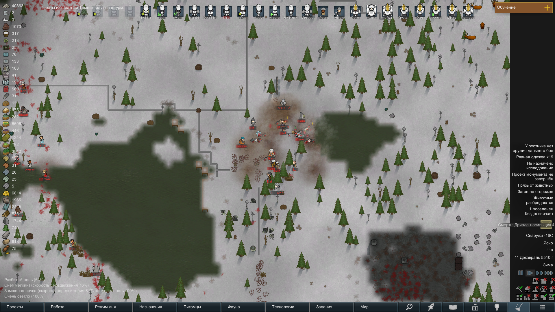 Меня хотят уничтожить... хоть и отбил, но какие еще 73 снайперские винтовки в осаде... это еще без скриншота, где было около 20-25 гранатометов. Я тогда решил проверить как это все взорвется и потерял двух колонистов и 80% животных, так как напали со стороны них... взрывов было много...