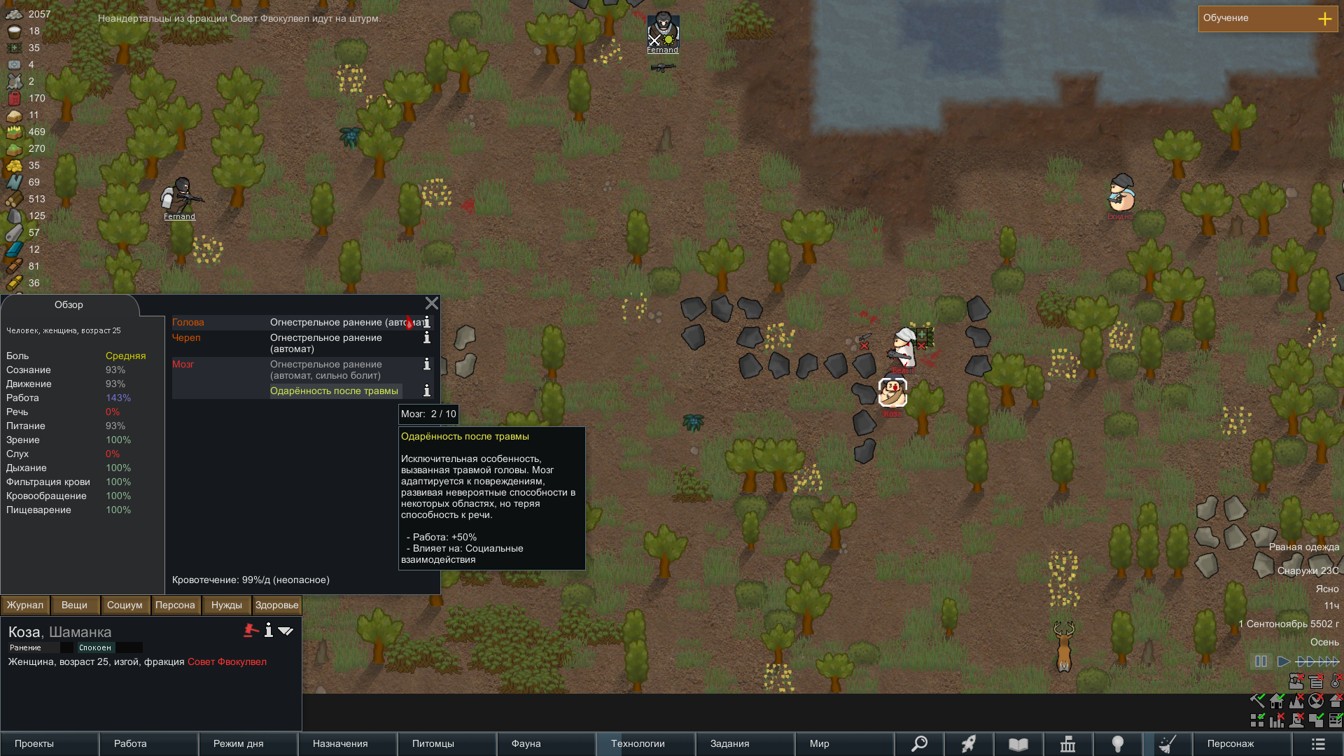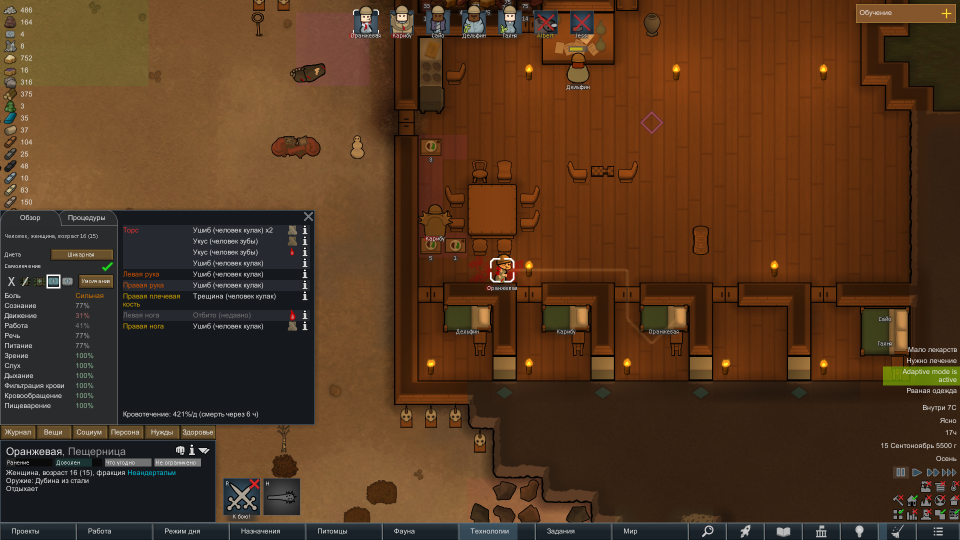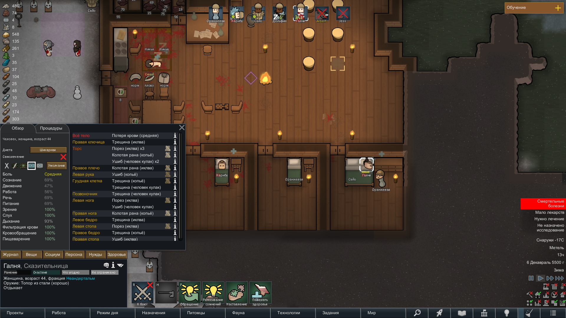 Какой же Ад играть кем-либо кроме людей. Вот неандертальцы. На первой картине, это просто социальная драка. Их две было. Отбили ногу, чуть не убили. Почему? Просто так. На следующей драке ее вообще убили. Думал это как в симулятор поиграю, не буду без загрузок. Но зачем в это играть? Колонист просто умирает... от драки... вся колония погибает из-за этого, так как не хватает строителя-садовода?