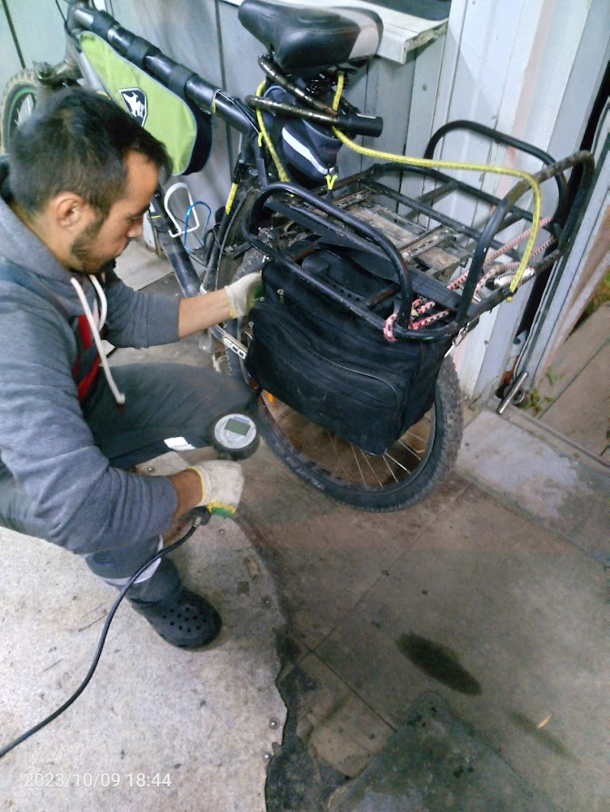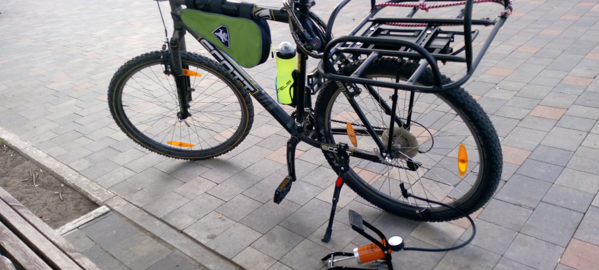 Попытался накачать переднее колесо, оно оказалось полуспущенным, даже ниже 40 ипс заявленных как минимум на колесе. Заднее колесо не удавалось накачать как бы я не пытался. Из ниппеля выпала какое-то резиновое колечко-прокладко, причем я не понял откуда именно. Засунул его в серебристую насадку, никакого эффекта. Тогда засунул в черную насадку, тоже нихуя. В общем взял второй насос, у него спускал шланг у основания насоса, хотя я привинтил гайку до упора. Пришлось снова ебаться с первым насосом. В общем им невозможно накачать колесо нормально, манометр упирается в 3 бара и дальше никак. Закурил Мое ебало