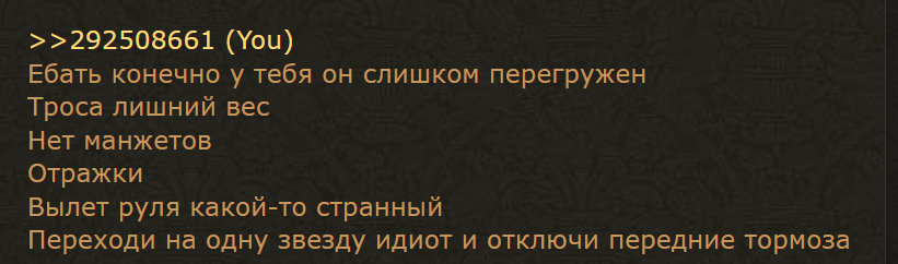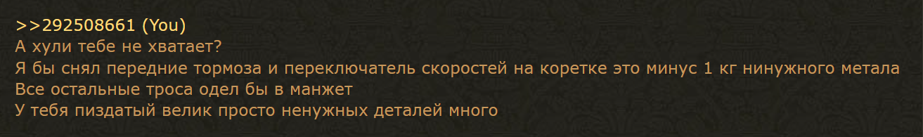 >>705348 Кстати, поссал на рыло мудаку, который заебывал в велаче советами менять шину и руль самому. Я только за то чтобы уметь обслуживать технику, но САМо-шиз ничего другого не заслужил