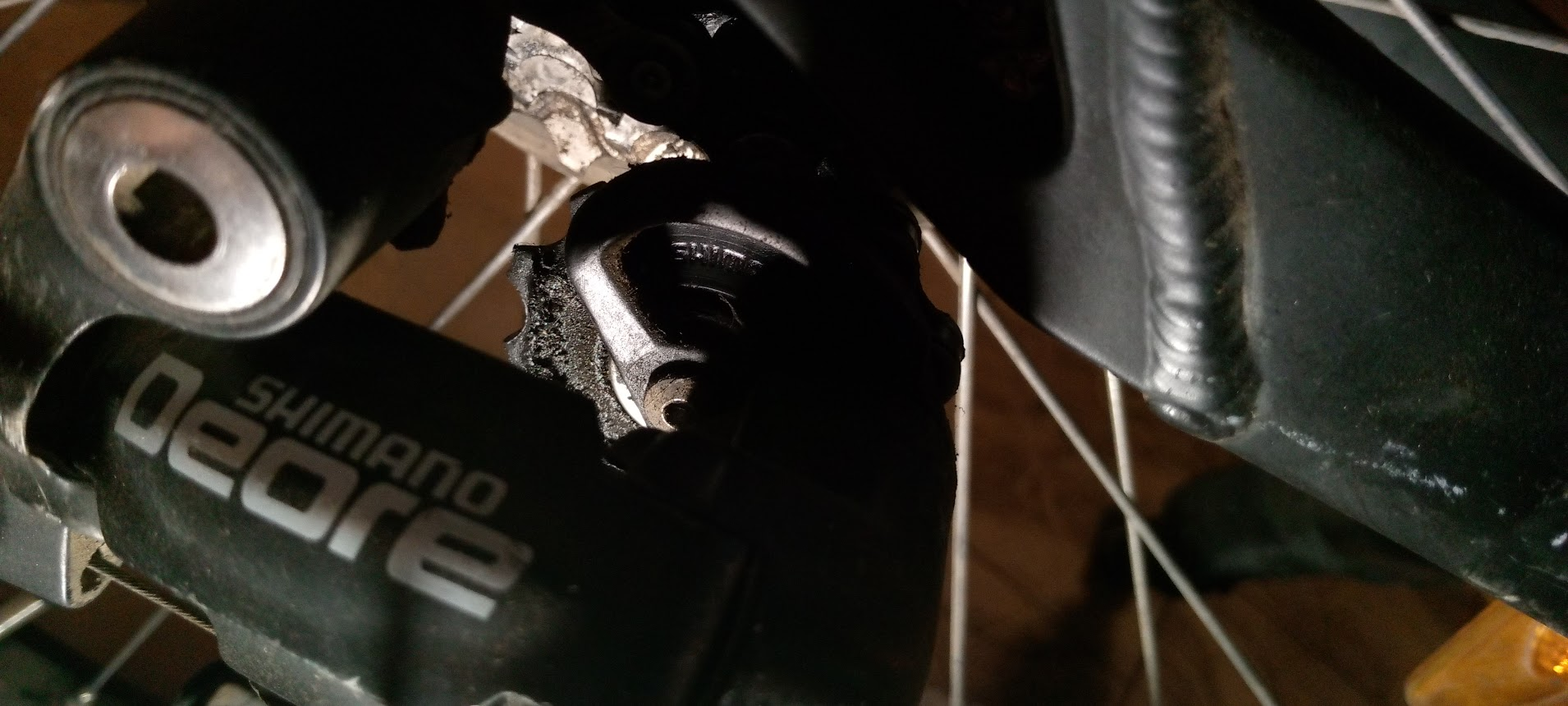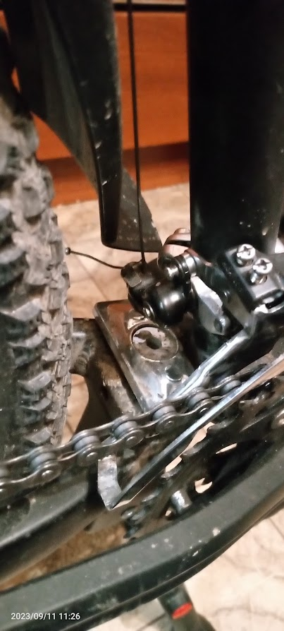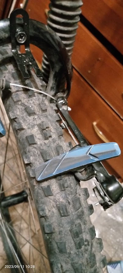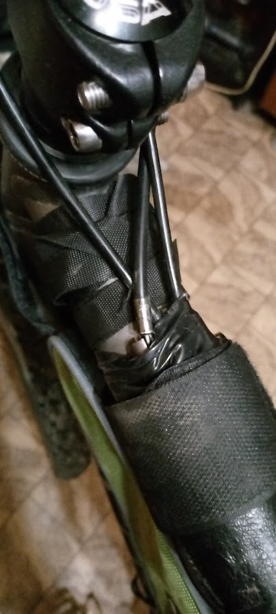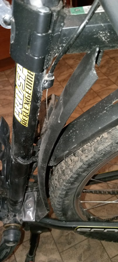 Снял колесо, удалось закрутить подножку максимально далеко от колеса, вчера она разболталась и постоянно задевало колесо, приходилось 100 раз поправлять. Вот этот обрезок крыла мог отвалиться от рамы при езде и задевал колесо. Далее вчера заметил чтоб изолентой рубашка вылетает из паза, от чего тормоза начинают чиркать по ободу. Еще багажный трос мог открепиться и звенеть об спицы. Даже намотался на втулку, пришлось долго и мучительно извлекать. Переднее крыло несколько раз отвинчивалось и тормозило переднее колесо. Сначала завинчивал крыло на место, потом снял и примотал к багажнику. Все это в совокупности и по отдельности охуительно мешало ехать. Когда едешь в гору, любой из этих шумов давит на психику и кажется именно из него тяжело крутить педали. Постоянно слезал и проверял где там что задевает, ехал несколько метров и снова слезал посмотреть. А в велаче петух с пеной у рта кричал что велик в порядке, и это я хуевый ездок. Сейчас эти проблемы порешаю полностью и частично