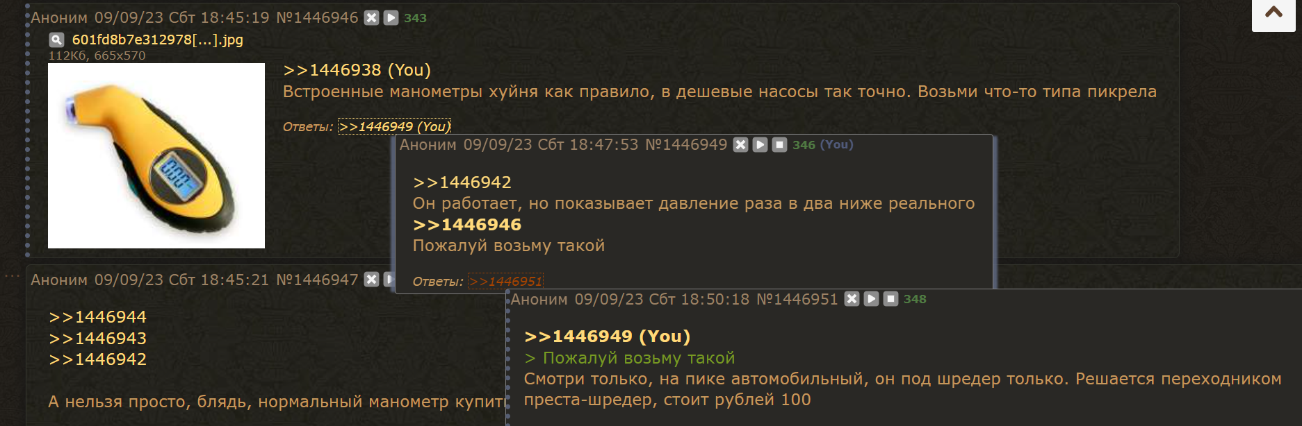 >>710992 >Тупорылая скотина мнит себя экспертом >Реальность показывает что он нихуя не знает Пояснишь заодно как манометр должен через переходник давление мерять?
