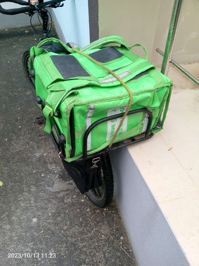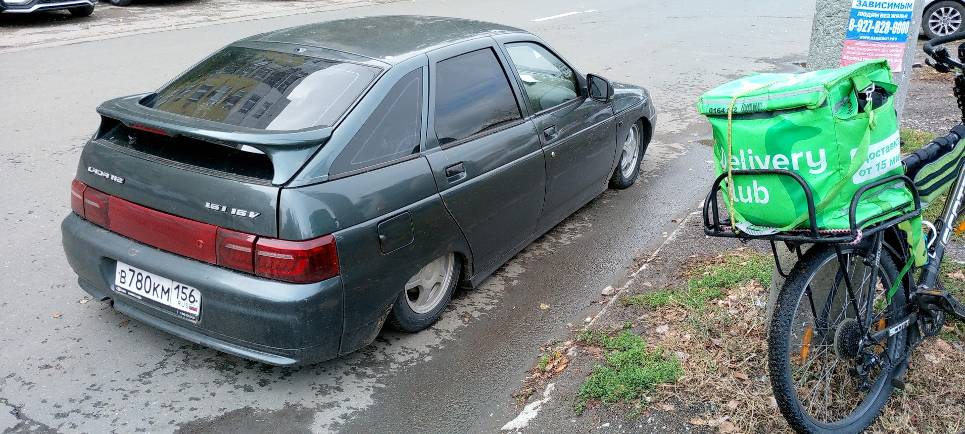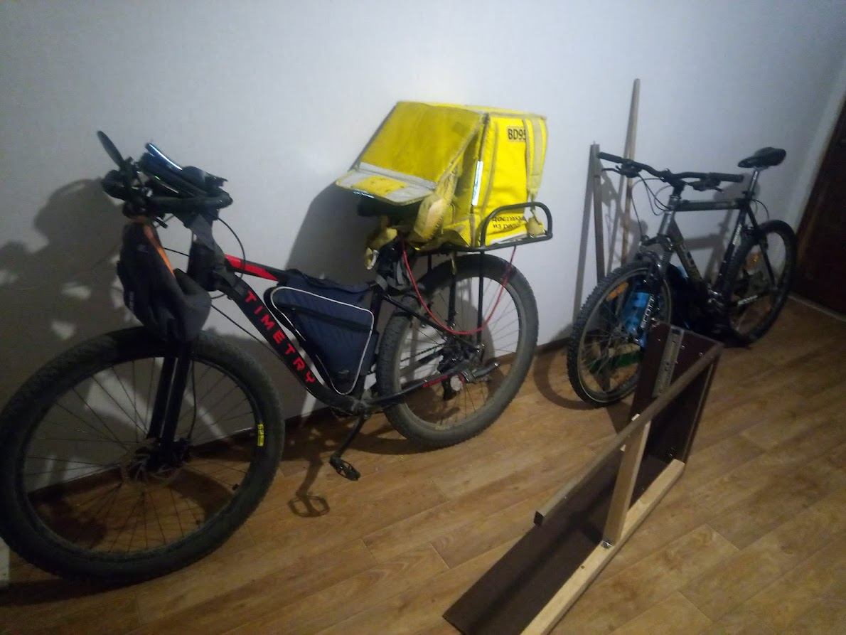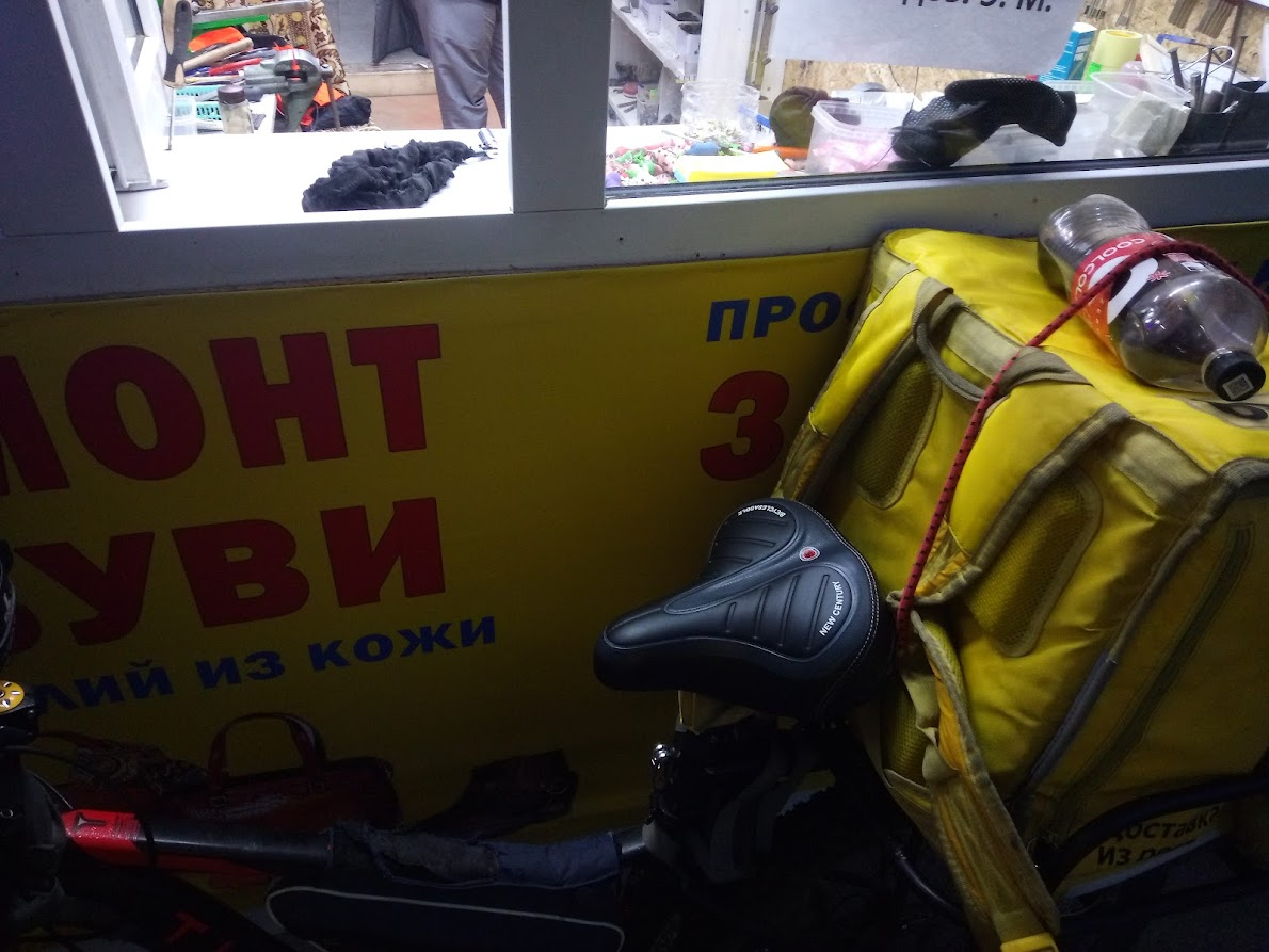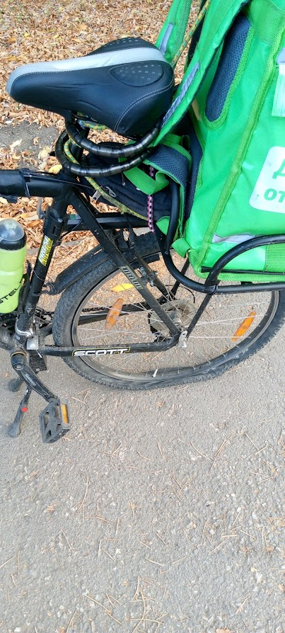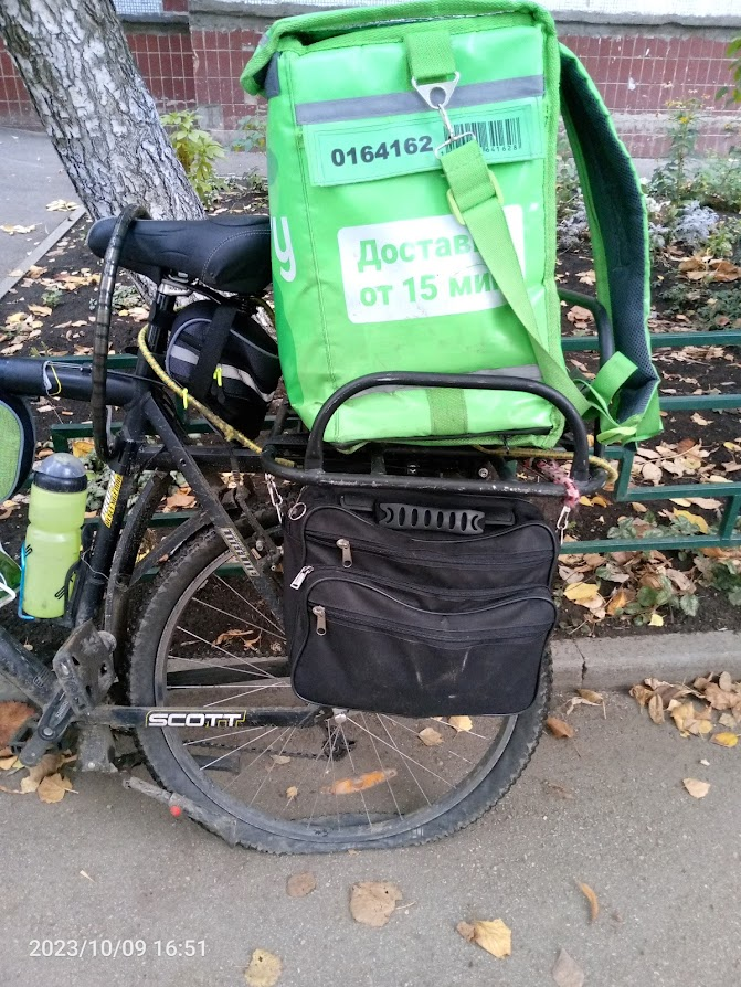 Сегодня за 6 часов сделал 16 заказов и установил личный рекорд. Не знаю что на меня нашло, может бутылка торнадо, купленная с утра, или наконец-то руль подошел, но работалось в кайф, несмотря на дождь. Скорее всего помог пеший режим, с ним не посылают на другой конец города за сто рублей, катался по своему району, время давали столько, что успевал купить пожрать шаурму по дороге в ресторан. Встретил шарящего, который насадил руль на удлинитель. Обычно мой велик выше всех.