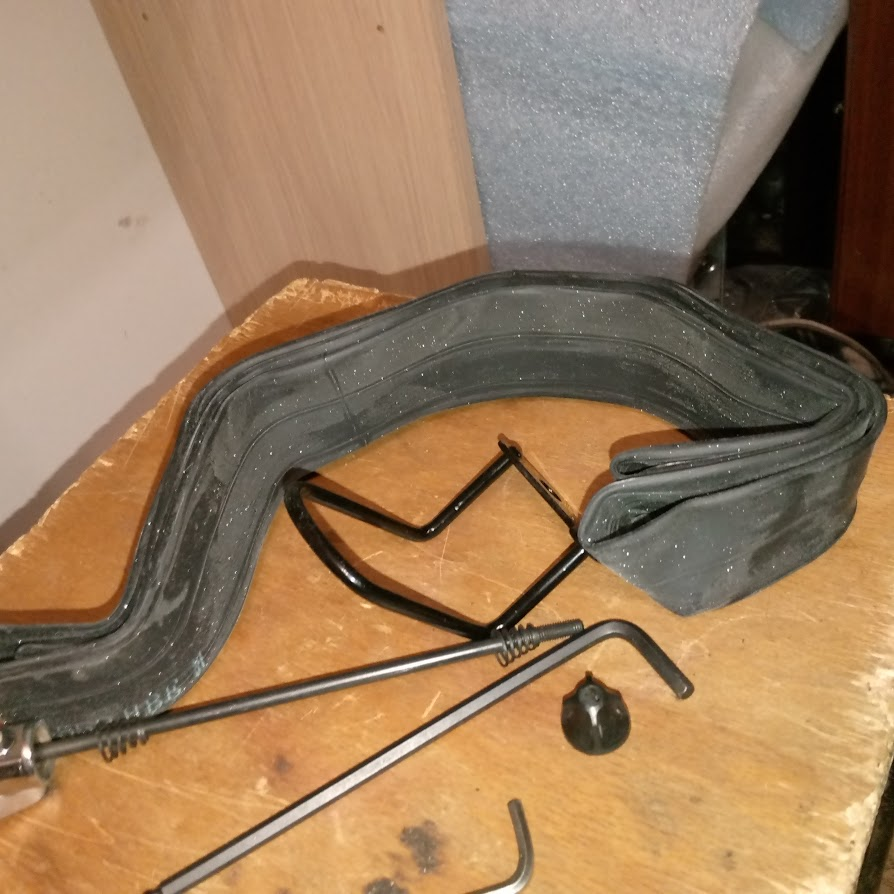 Нашел древний батин кронштейн от вулканизатора. Раньше не понимал как это должно работать, а сейчас все понял как только взял в руки. Надо бы заклеить камеру и возить с собой на всякий случай. Встал на весы показали меньше 100 кило