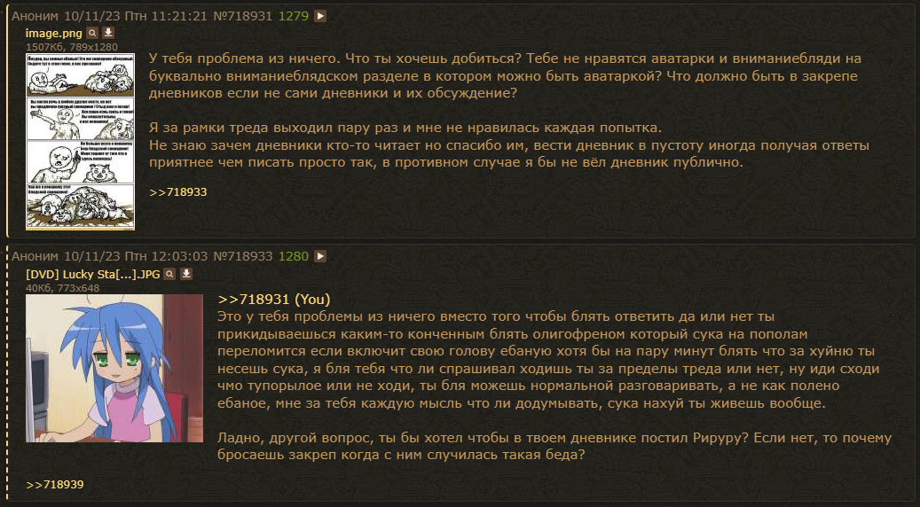 Мнения опрашиваемых: Рируру заебал, в закрепе можно узнать про то какие есть дневники в разделе, закреп общая площадка.