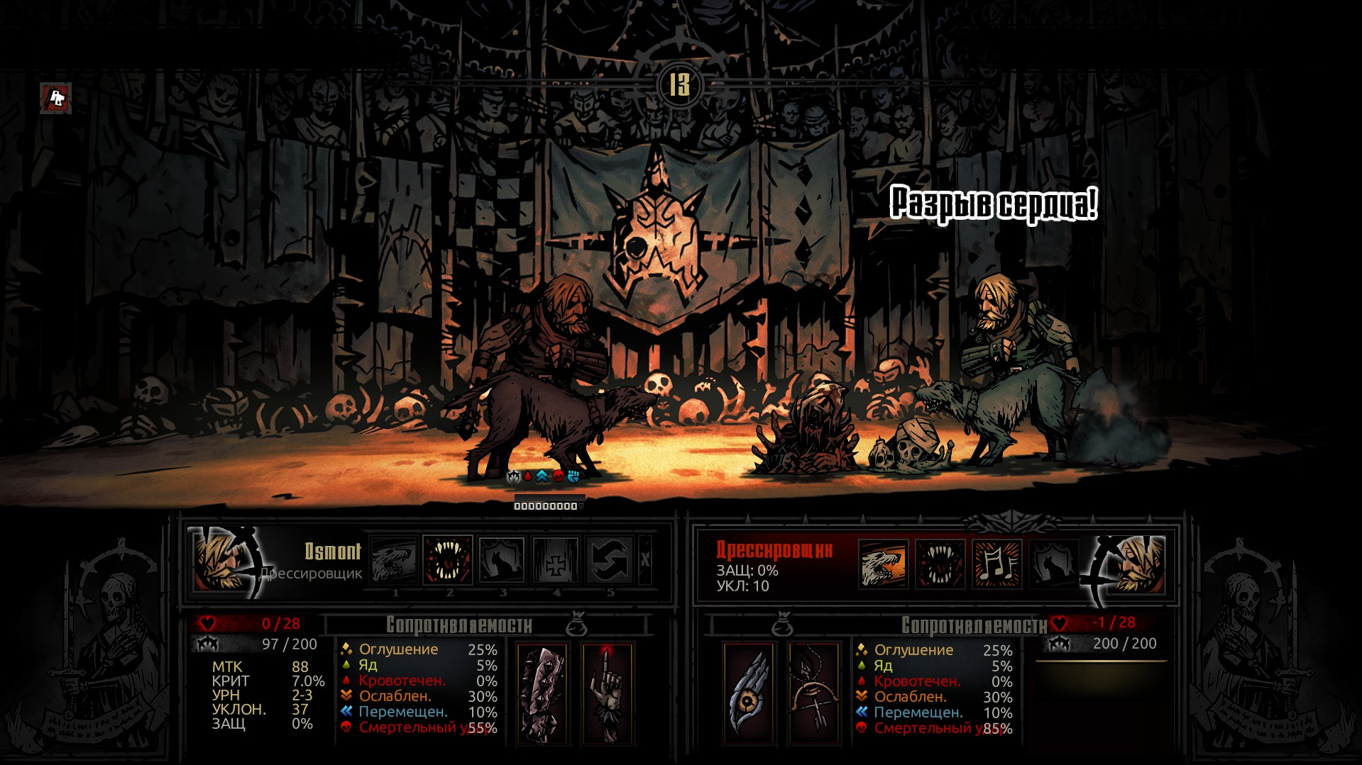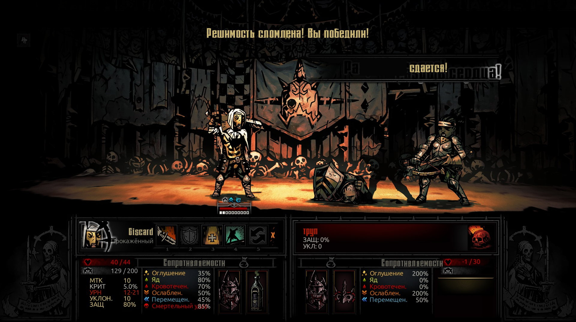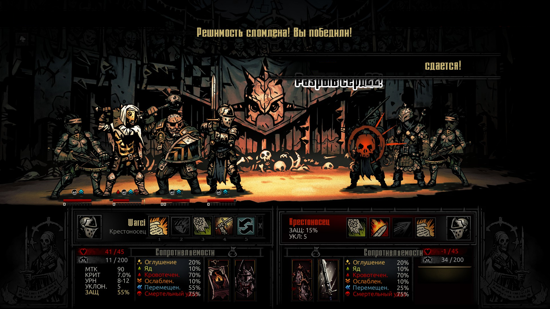 Это просто омерзительно. Почувствовал себя тем самым везучим последним рангом. Он просто промахнулся где-то около 4 раз подряд. Я убил 1 наскоком сразу двоих, одного ударенного один раз и впервые. Потом он наложил на себя метку из-за психоза и я нанес удвоенный урон из-за чего он потерял меткость и был в 5 стрессе от приступа, он промахивается, и я его добиваю наскоком. Не убиваю, но приступ его убивает. Так не должно быть. Но ради справедливости, он сам ни разу не промазал в первые два раунда, хотя уклонения у меня было 60+ Я никогда не нажимал на сдачу, когда вернулся сюда, потому что думал, вдруг такой момент настанет, как здесь. Спустя несколько месяцев настал.