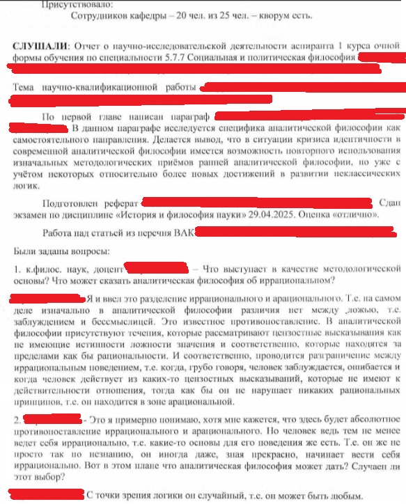 Но прикол в том, что эта коряво звучащая формулировка темы диссертации всем сразу очень понравилась. Но в неё всё же внесли изменения, чтобы она звучала ещё корявее. На данный момент моя официально утверждённая тема звучит следующим образом: "Иррациональный и арациональный типы социальных конфликтов: социально-философский анализ". Два раза добавив туда слово "социальный", чтобы уж точно всем было понятно, что это работа по социальной философии, а не истории философии!