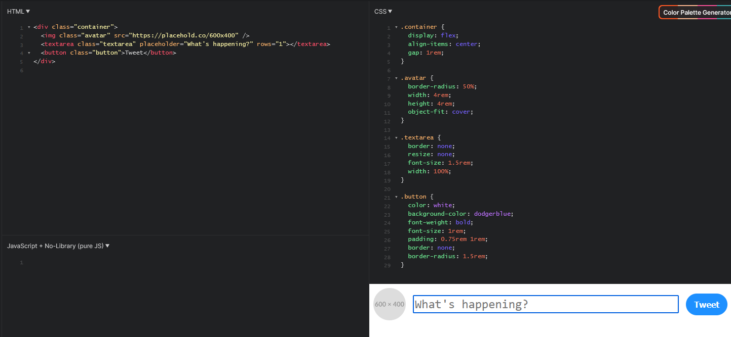 Сегодня первую половину дня меня трясло, пил чай, кушол, делал html задания. Видео уроки не смотрел. Результат не удовлетворяет, весь день потратил на последний блок пытаясь отцентровать все элементы. Сначала сделал через align-self:center, после чего пытался заалайнить по правому краю кнопку "твит". Потом сделал через vertical-align:middle, но кнопку "твит" так и не смог привязать к правому краю.