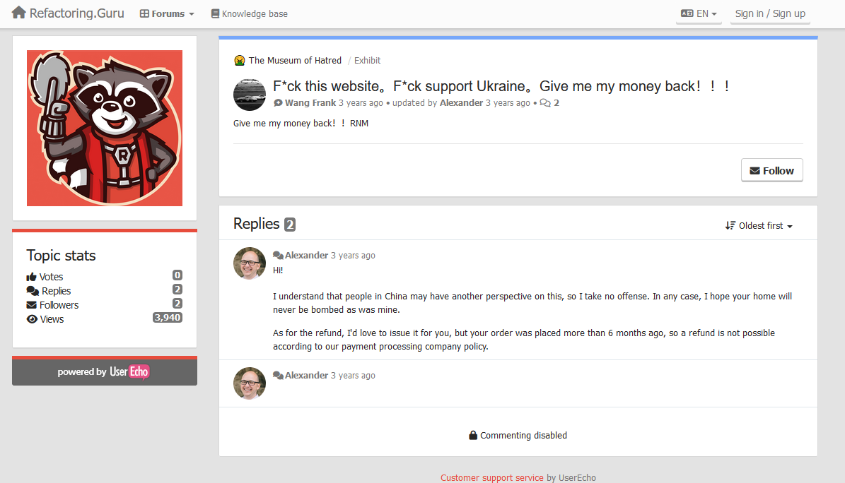 Зашла на форум, затем в ветку "Музей ненависти (смайлик тошноты)". Вижу сей опус: >When Russia invaded Ukraine in February, I changed the website's logo and created a page describing my personal story of the war with a call to support Ukraine and our people in this struggle. Immediately after, I started receiving hate messages from people across the globe. I decided to put them on display in a special section of the forum so that people knew what propaganda can do to one's mind.