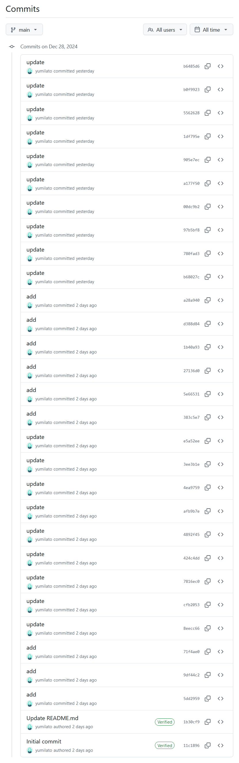 Коммиты, которые называются либо «add», либо «update», те, что «add» — добавляют по одному целому файлу, те, что «update» — пустые.