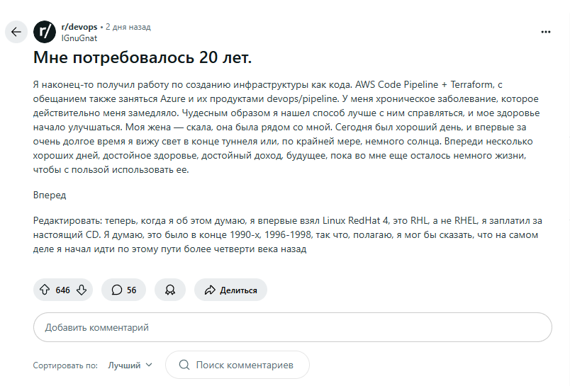 >>779658 >>779659 Когда я только начинал изучать программирование, я часто задавал вопросы на различных программистких форумах и тг каналах. Кто-то действительно помогал, кто-то кидал предъявы в стиле "Зачем пришел? Здесь нужно задавать только интересные вопросы, а не разжевывать каждому новичку очевидные вещи" (конечно же, очевидные с точки зрения предъявляющего). Когда вопросы стали значительно сложнее, стали всё чаще игнорить. Оно и понятно - ответить, что такое цикл - может и хочет практический каждый, а например проверить код на соблюдение хотя бы банальных принципов SOLID - могут единицы и ещё не факт что захотят.