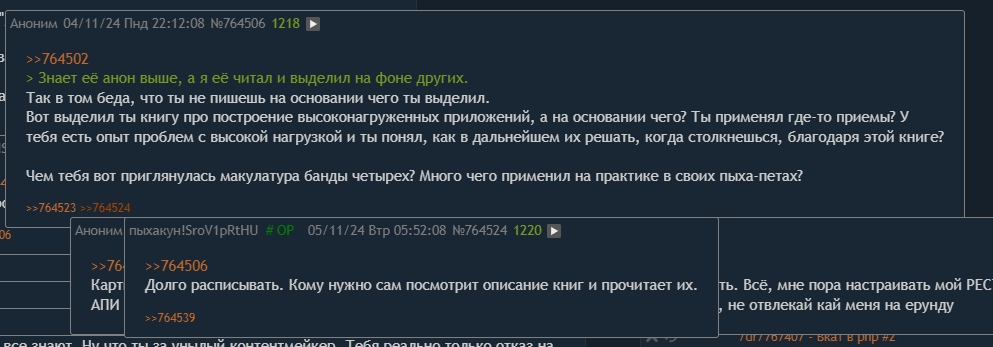 >>779621 Вопрос там был такой >Вот выделил ты книгу про построение высоконагруженных приложений, а на основании чего? Ты применял где-то приемы? А эта хуета на ОПе обдристалась и теперь пиздит тут и перемешивает в один разные посты. При этом тут же следом отвечает на этот же самый вопрос)