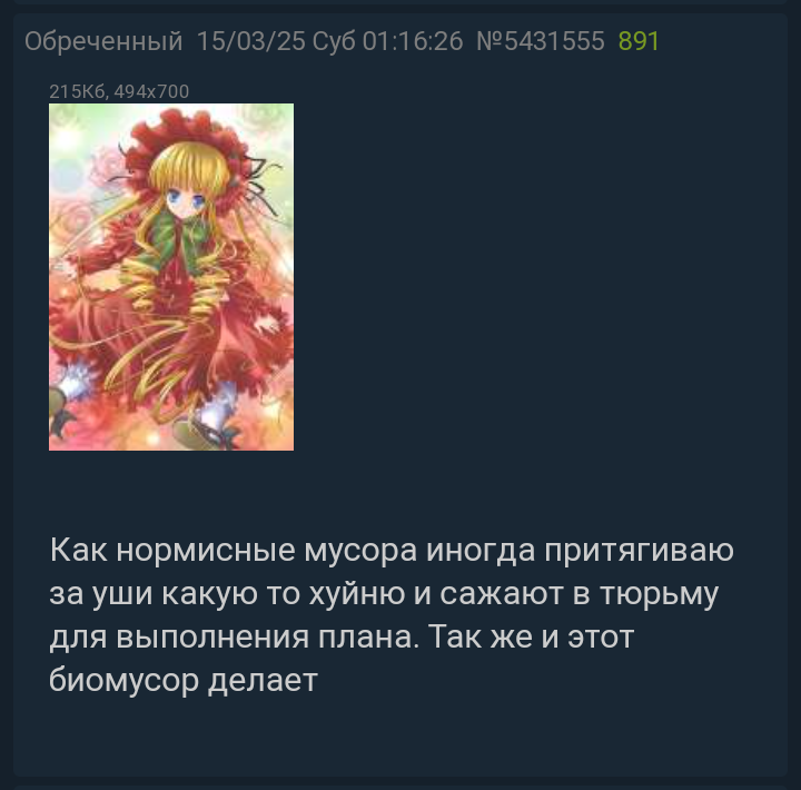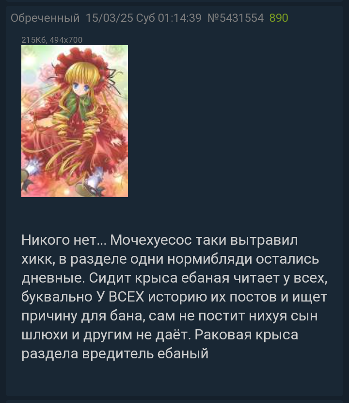 >Там ничего кроме самоподсосных паст нет по большому счету >Не застал вовремя = не сумел определить значимость = ничего не понял. Стремительная деградация борд началась именно с блокировкой / затуханием / забвением Лурочки, и во что вылилась в итоге? >В /b/ обитает вообще непонятно кто, иногда впечатление, что как таковых постеров там попросту нет, одни извращенцы, которые пользуются этим в качестве личного чата. Админ Двача пропутенский ура-патриот, при том что аудитория борд всегда была аполитичной / оппозиционной. Ну и т.д. >Сам сайт-то (ЛМ) тролльский весьма, а может и слишком, но во что Двач развился бы без него? Ни во что, имхо. >Мб ты просто смотришь там что-то не то.