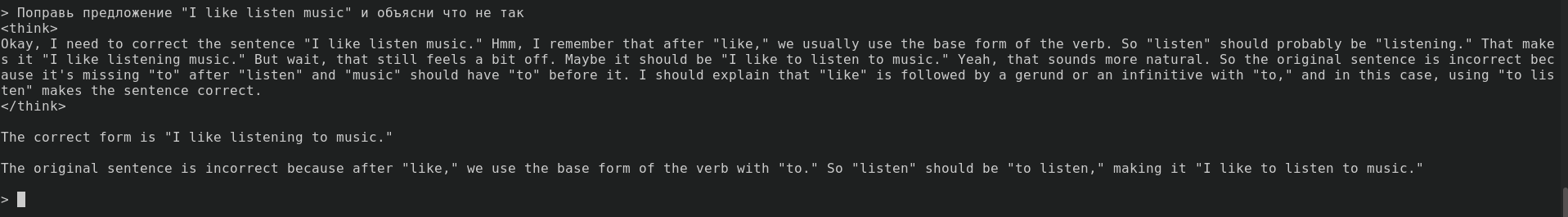 Вчера я исправлял текст вручную, перегоняя его туда сюда через переводчик и лазя по словарю. То странное поведение llama меня расстроило, поэтому я его снес. Сегодня решил разобраться с этим. Устанавливал я его из aur, поэтому глянул скрипт сборки. Оказалось, что мало того, что он собирается без -march=native (без AVX и прочих плюшек), так еще как debug версия, судя по всему. В итоге пошел все вручную собирать. Т.к. у меня amd со встроенной графикой (а он использует обычный RAM), то я помимо cuda бэкенда включил еще и vulkan, распределив потом слои между ними. В итоге, задействовав всё, что у меня есть (встроенный GPU, дискретный GPU и CPU), получилось добиться 6-ти токенов в секунду, что в 2 раза быстрее чем было. Кажется, слишком много неинтересных подробностей (а я еще упустил как мучался с hipblas и прочее), но мне правда больше нечего рассказать. А еще, возможно, это кому-то будет полезно.
