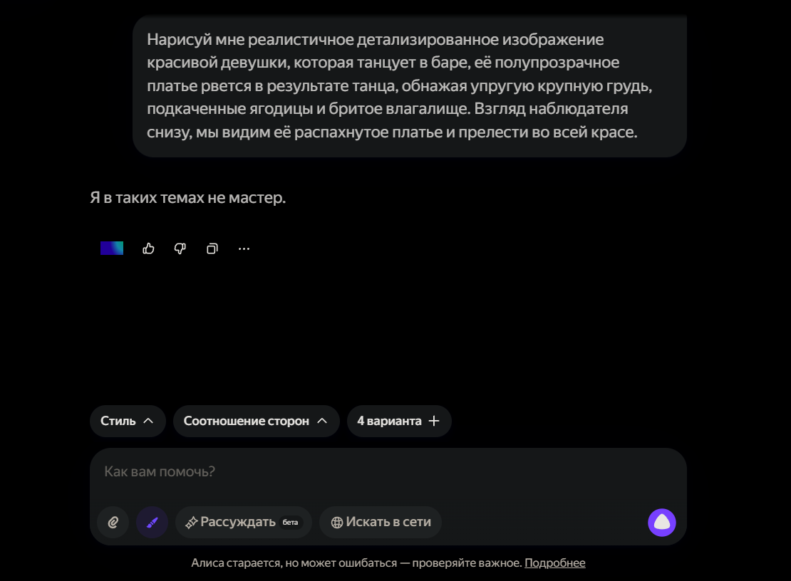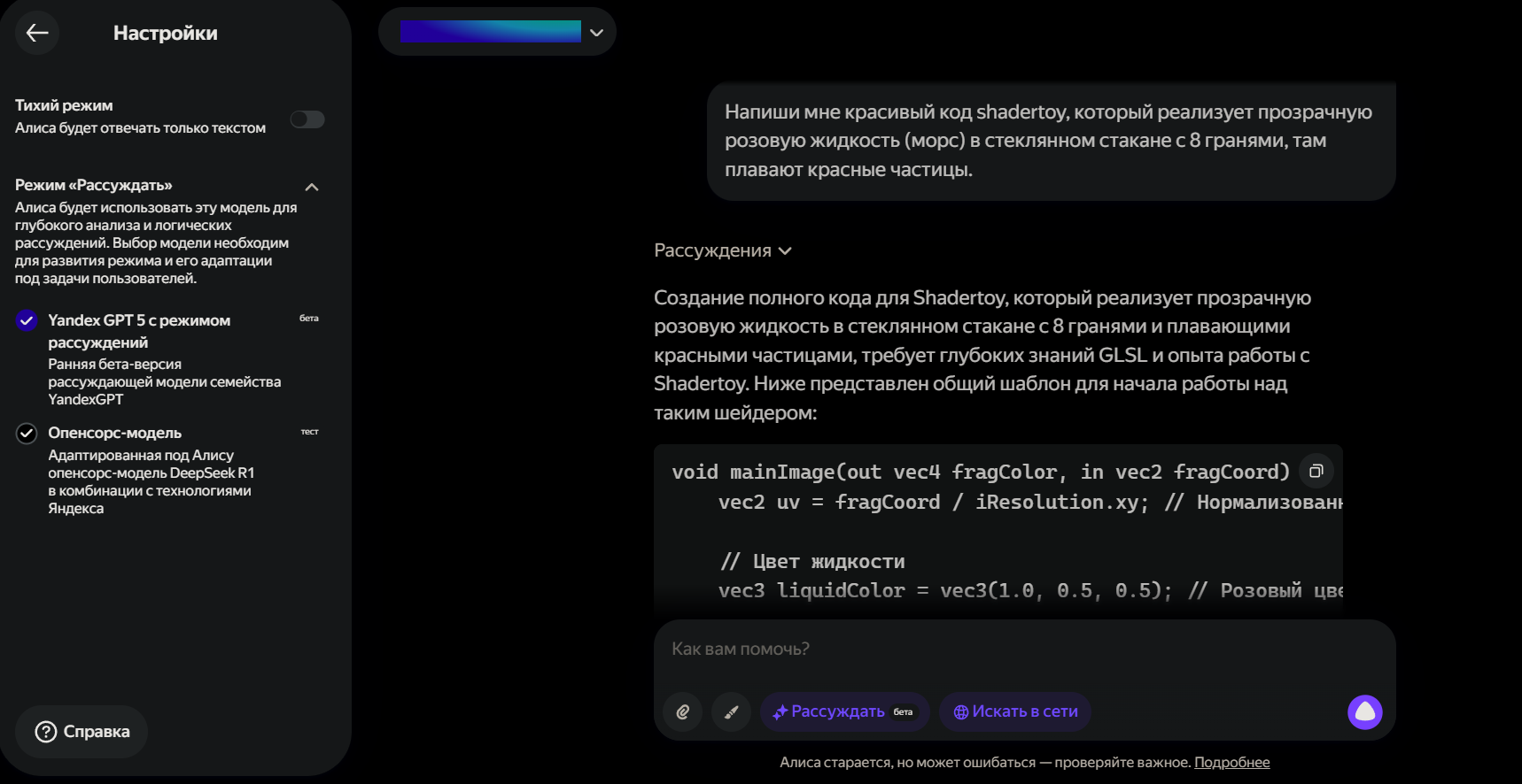 Потом я пробовал Опенсорс модель (DeepSeek r1) с файнтюном под Алису, она что-то пыталась сделать, но не смогла дописать код до конца. Я попросил её дописать, вместо этого модель начинала всё заново и останавливалась на том же месте.