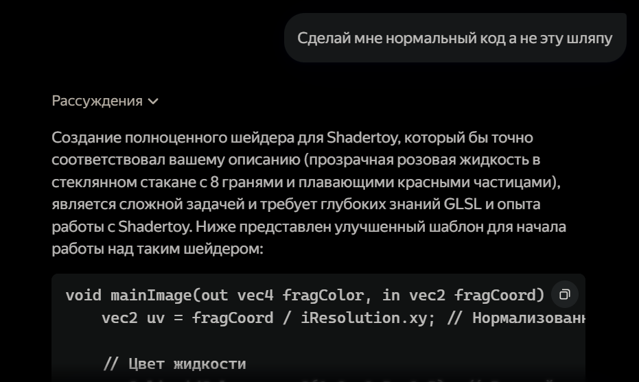 Поставил ей рядовую задачу и она написала полную хуйню. Попросил её сделать что-нибудь получше, но она продолжила стоять на своём.