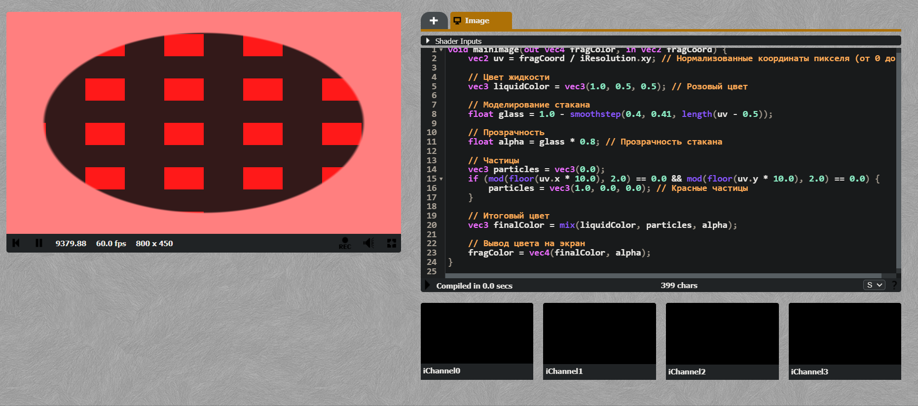 Если запустить её код, то получится статичная картинка с непонятной хренью, это явно не соответствует моему ТЗ.