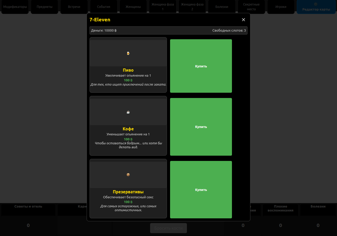 В начале игры можно брать карты модификаторы. Например, "Алкаш" - максимальное опьянение +6, "Любитель трансов" - хуи у проституток не приносят негативные эффекты.