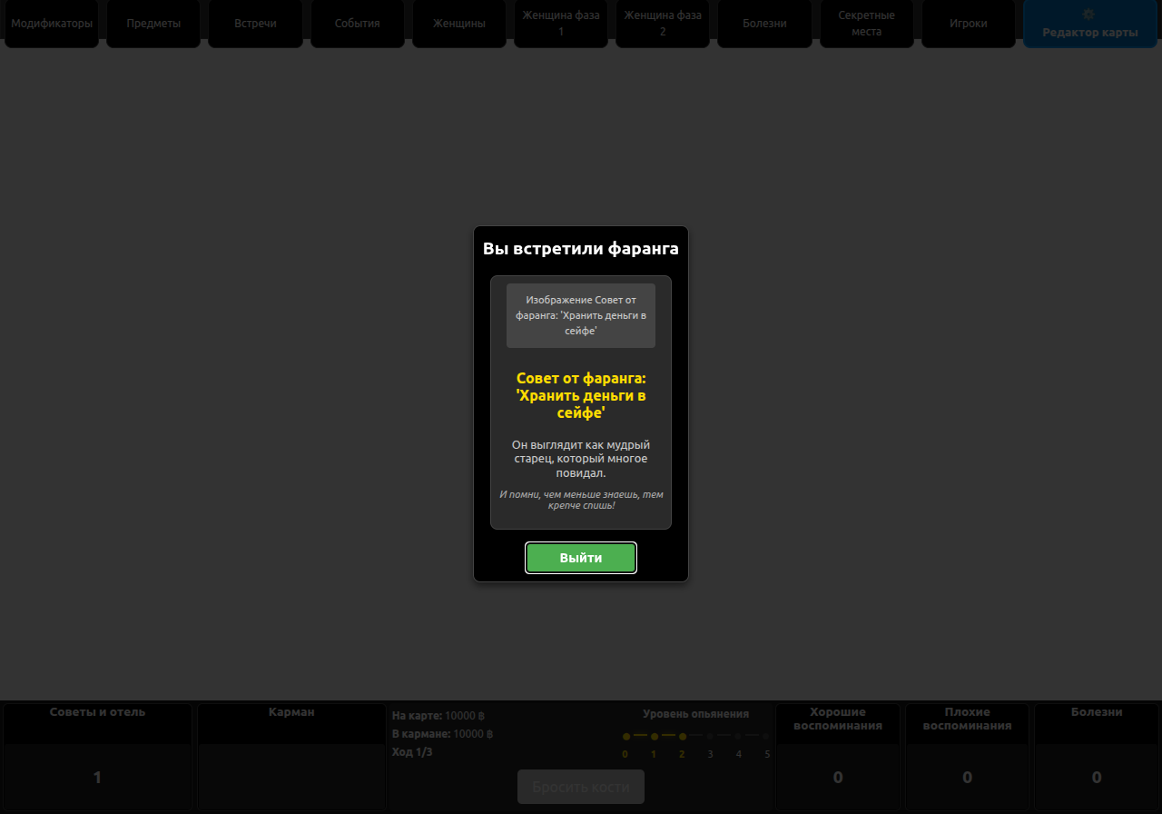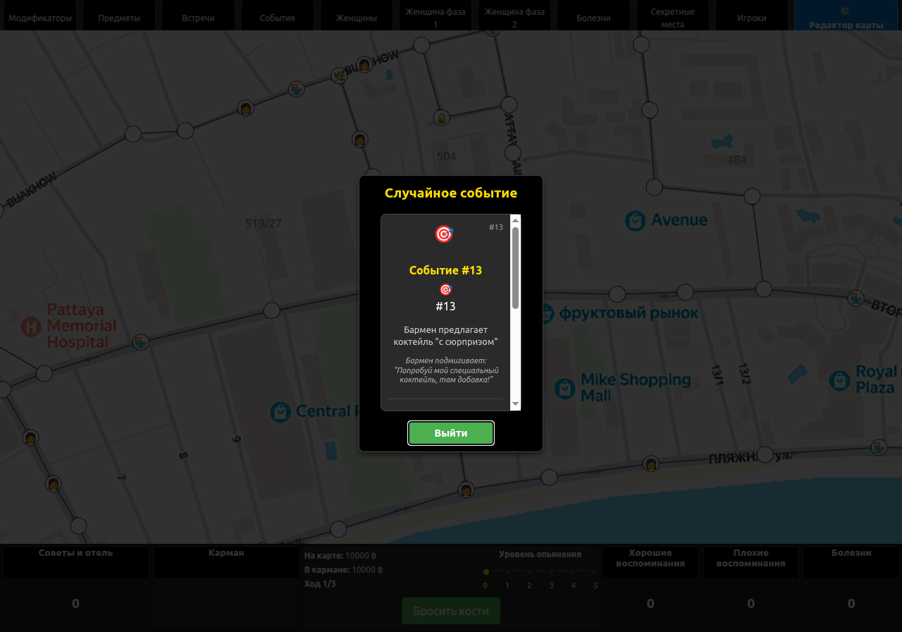 3. Секретные места. Точки на карте, на которые можно попасть, если получил соответствующий совет от фаранга. Там так же могут быть по три исхода, но в них не могут быть отрицательных исходов. Примеры: гого-бар с полным обнажением, джентельмен-клуб, пинг-понг шоу