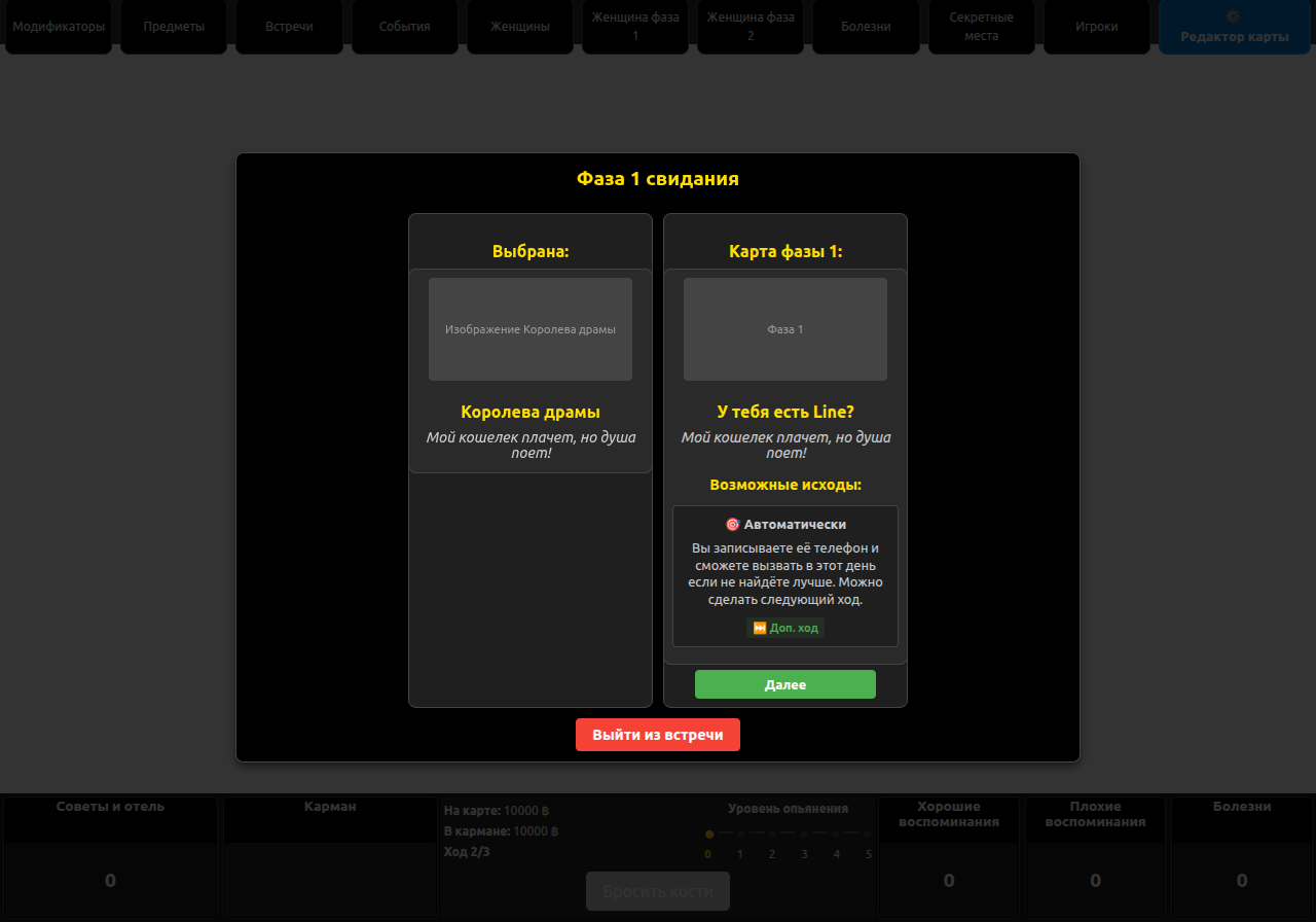 "Свидание" проходит в две фазы. В первой - колода с событиями которые происходят на улице/при знакомстве (схватил за промежность, а там ХУЙ), во второй - в твоём номере (Девка ушла до того как проснулся, и все деньги из кармана исчезли). При этом используется твоя карта "презерватив", если её нет, либо если выпало событие "порвался", то берёщь карту болезни.