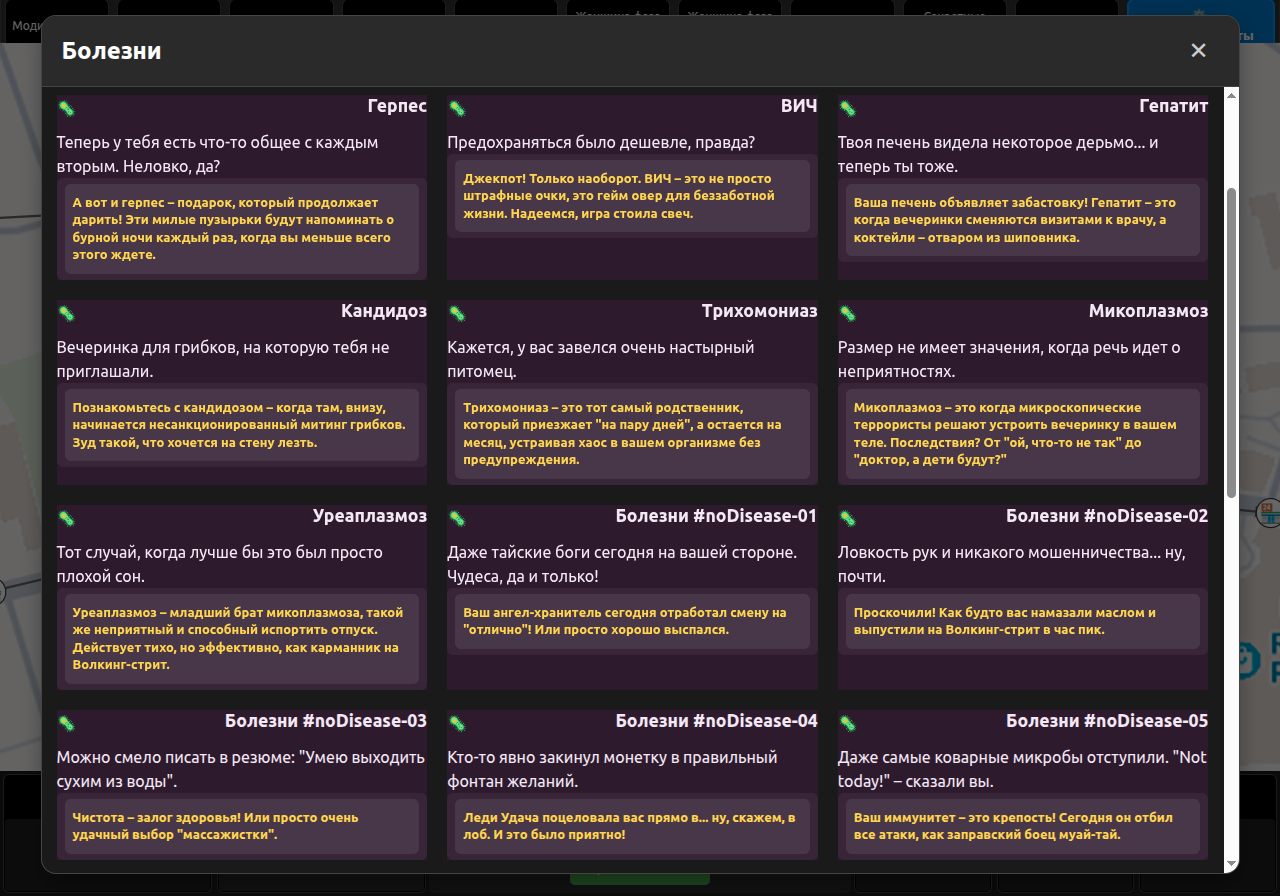 Карты болезней. Когда ты берёшь эту карту, то не открыавешь её сразу же. А только в конце игры. Так как не каждый секс приводит к заражению, 1/3 карт будут содержать реальные болезни и очки негативных восспоминаний. А две трети - карты с фразами типа "фух, пронесло" и "Бог миловал".