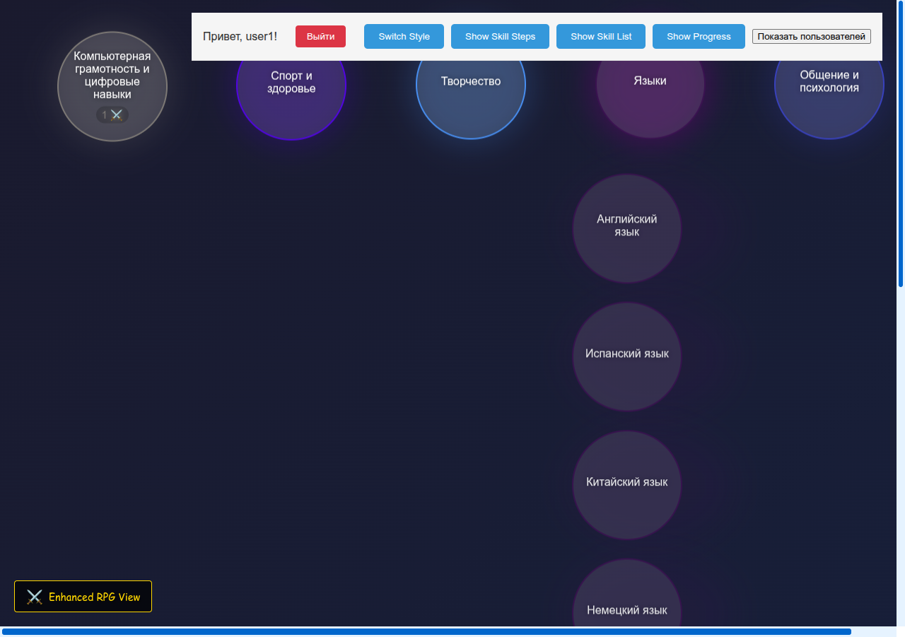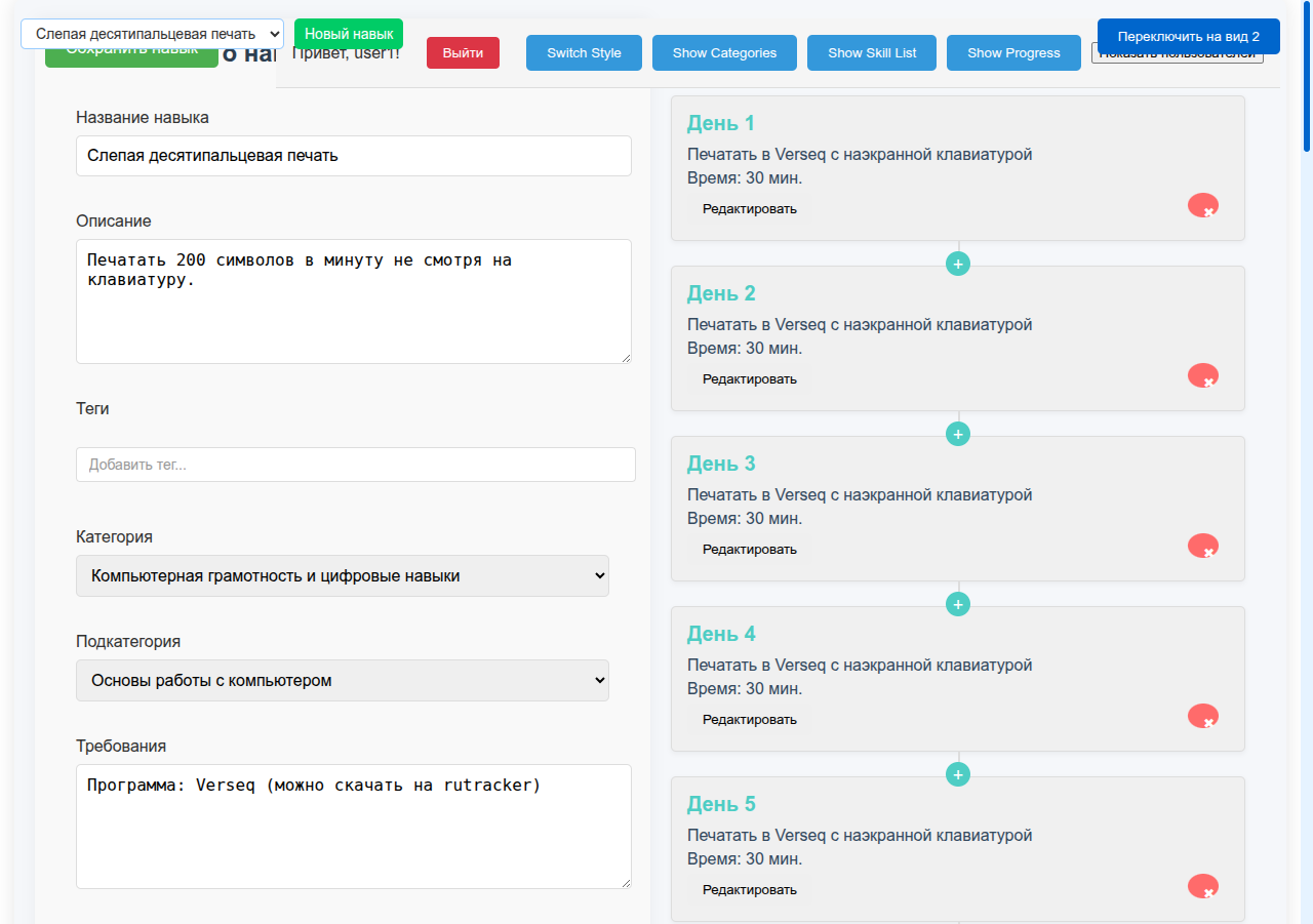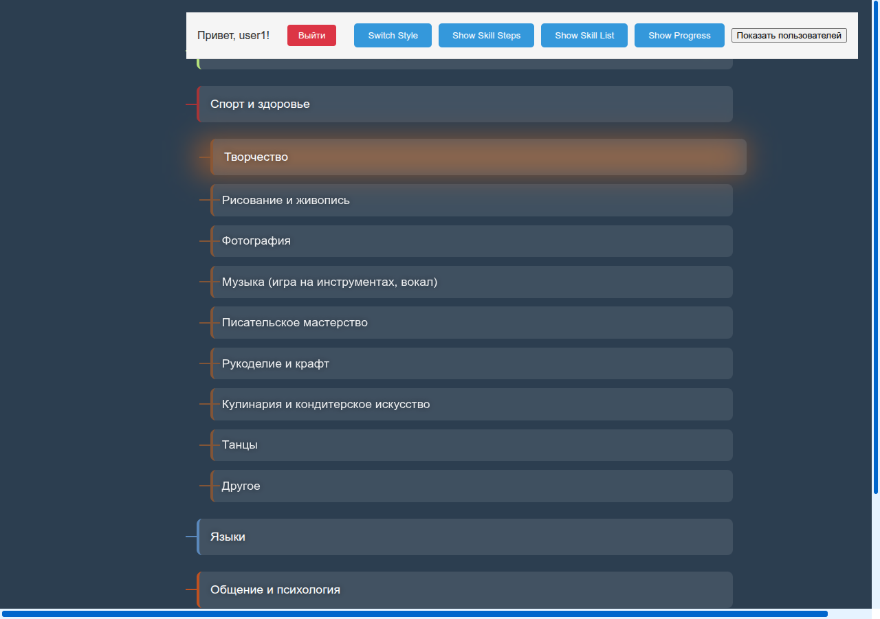 Все навыки разбиты на разделы и подразделы. Упор сделать на обучение без платы за курсы, информация должна быть в бесплатном / условно-бесплатном доступе. Будут элементы геймификации - очки, ачивки, счётчик дней без пропусков и тд. Комментарии под каждым путём, список изученных тобой/другим человеком навыков по категориям.